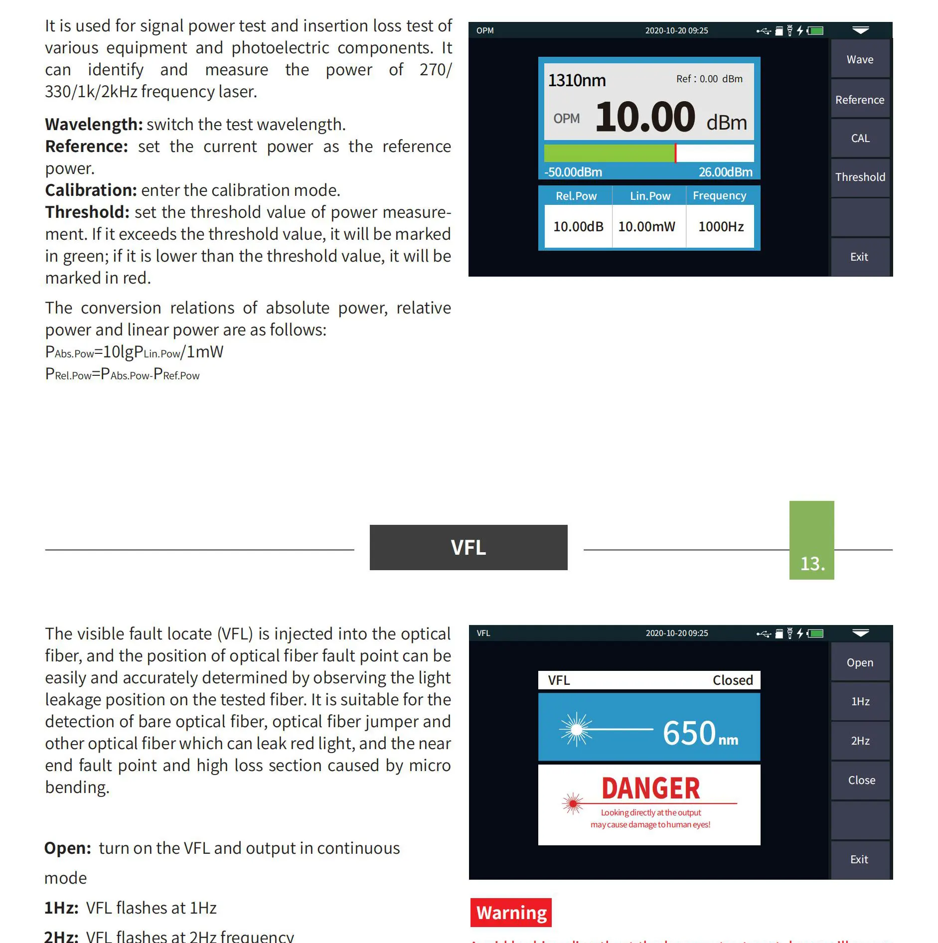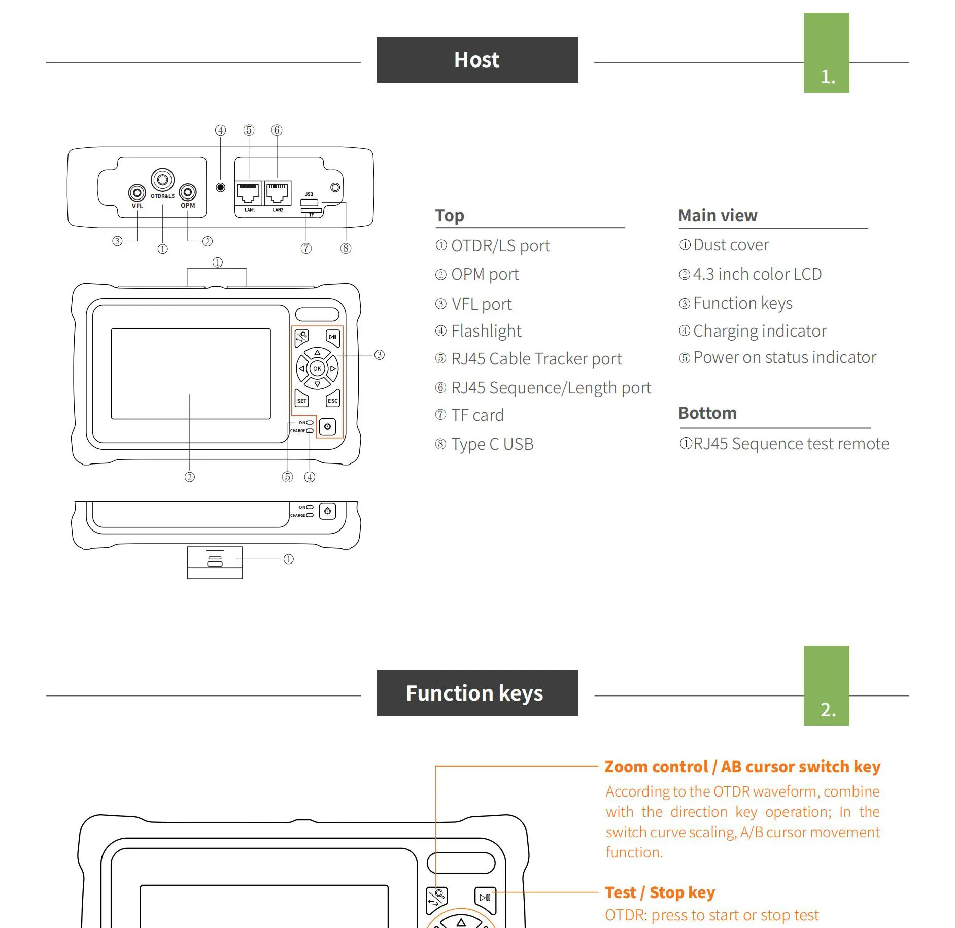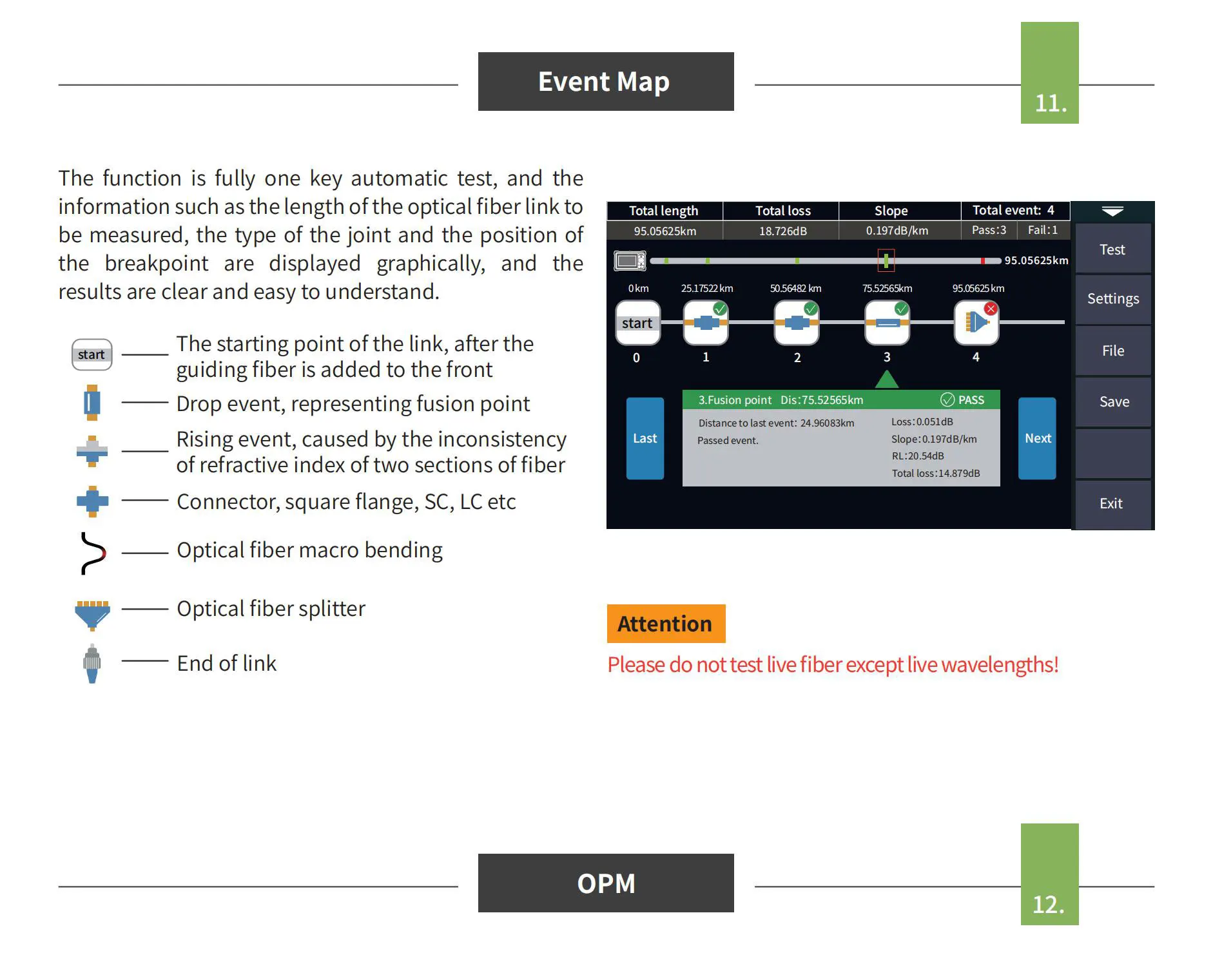 1) OTDR automático 2) experto OTDR 3) Mapa de eventos 4) medidor de potencia óptica 5) fuente de luz óptica 6) pérdida de inserción 7) Localizador Visual de fallas 8) Seguimiento de Cable RJ45 9) Secuencia de Cable RJ45 10) longitud del Cable RJ45 11) Inspector Endface 12) luz LED