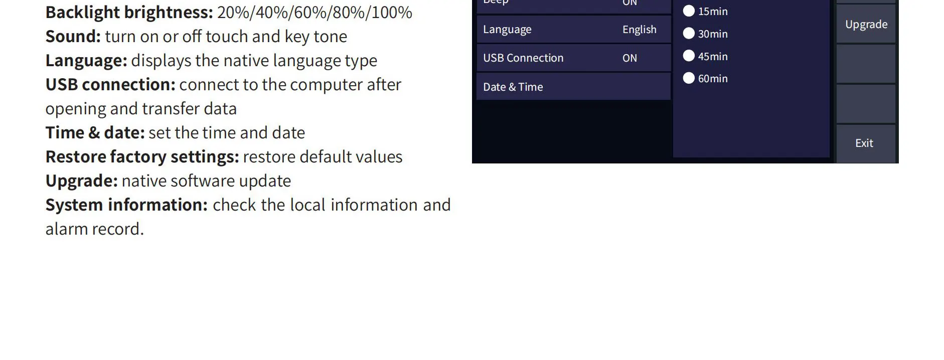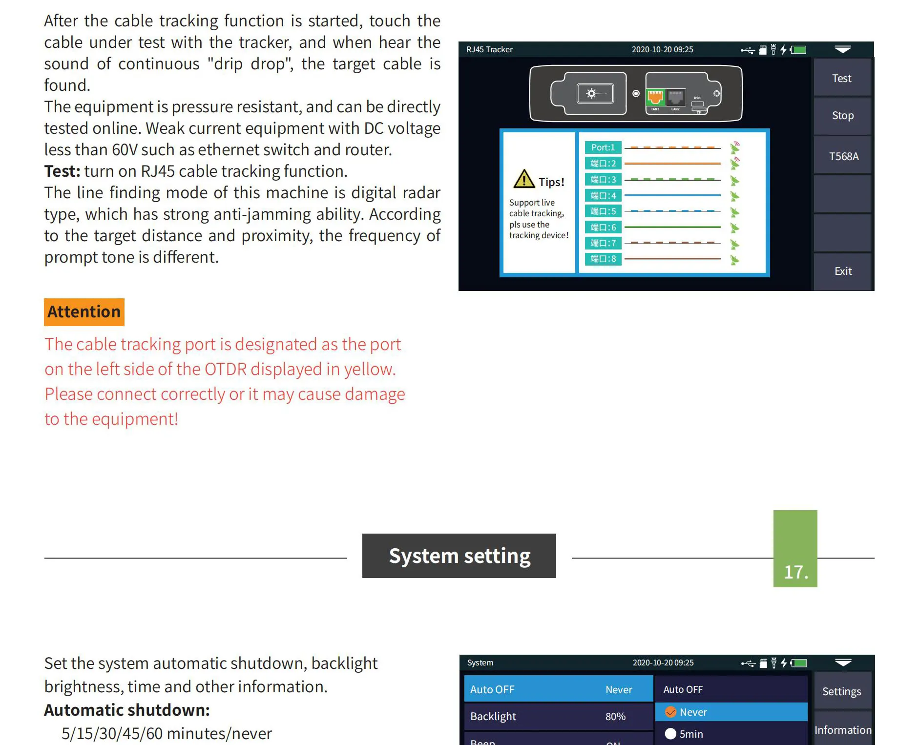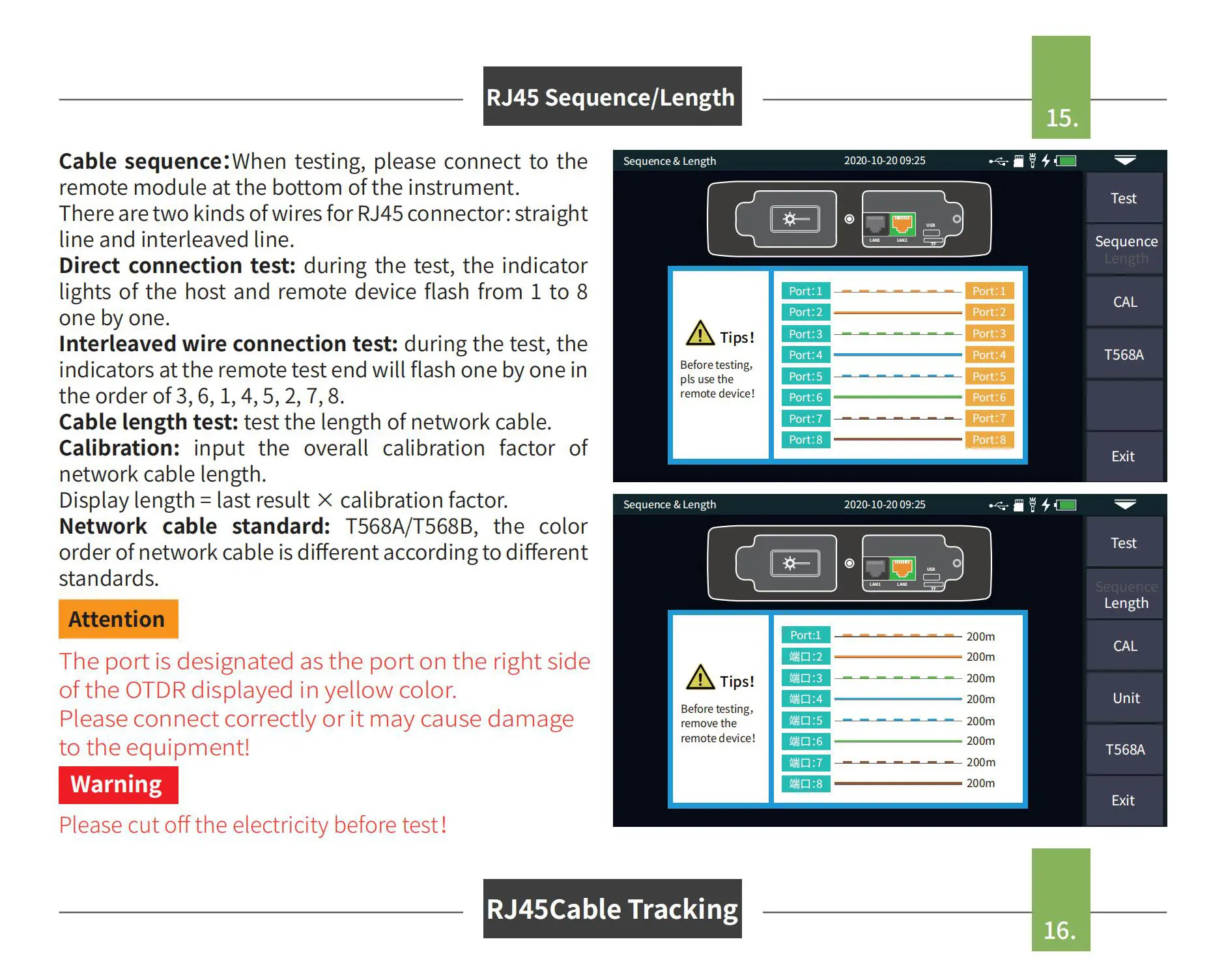 1) OTDR automático 2) experto OTDR 3) Mapa de eventos 4) medidor de potencia óptica 5) fuente de luz óptica 6) pérdida de inserción 7) Localizador Visual de fallas 8) Seguimiento de Cable RJ45 9) Secuencia de Cable RJ45 10) longitud del Cable RJ45 11) Inspector Endface 12) luz LED