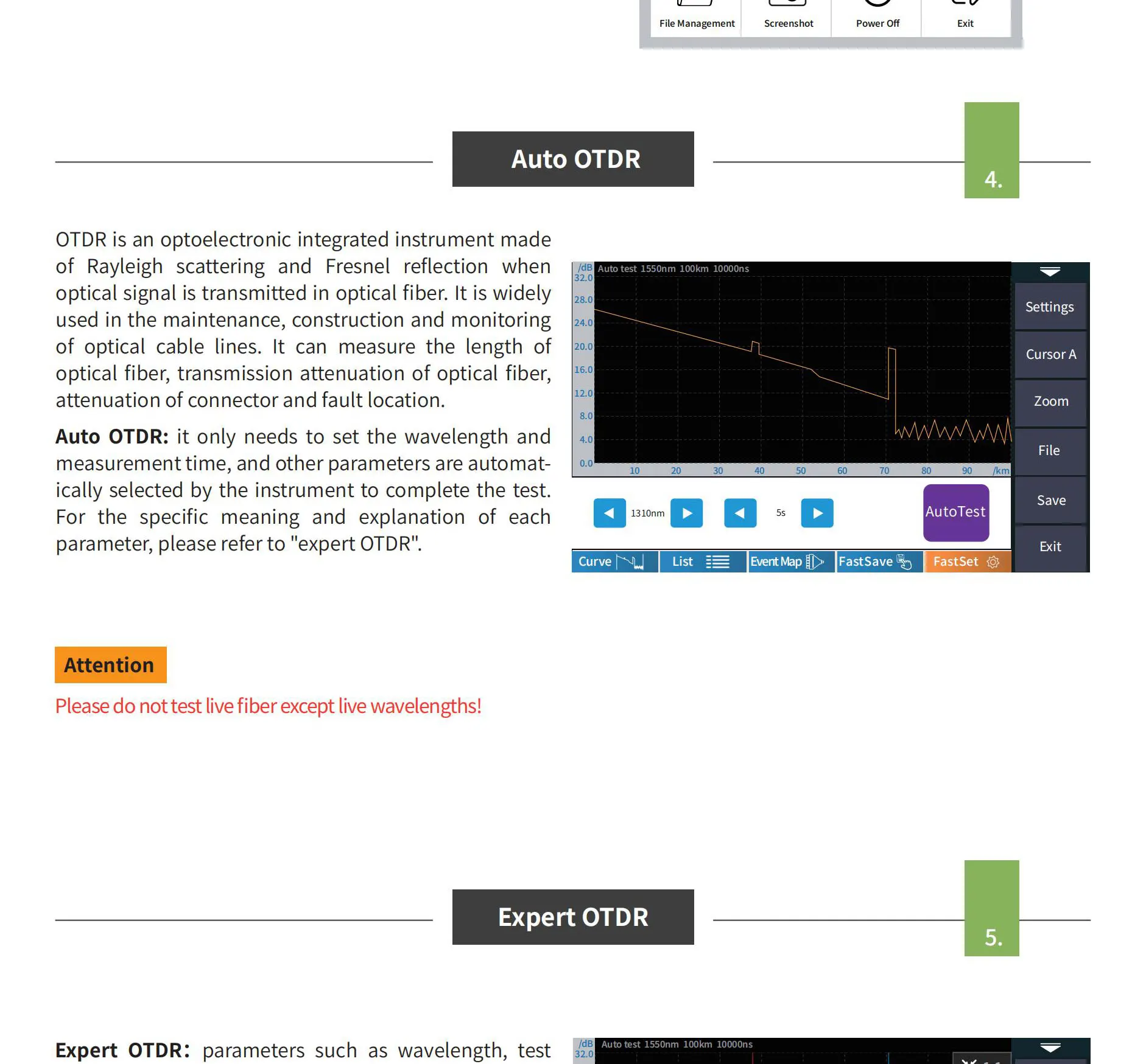 1) OTDR útil y ligero 2) combina todas las pruebas de fibra esenciales en un solo portátil con OPM, OLS, VFL, etc. 3) análisis OTDR fácil de entender con lista de eventos 4) verificación o solución de problemas de red PON 5) se actualiza fácilmente en el campo 6) Duración de la batería durante todo el día Podemos proporcionar servicio técnico en OTDR, y estamos buscando distribuidores para nuestro OTDR. Si tiene experiencia en ventas de equipos de fibra, contáctenos.