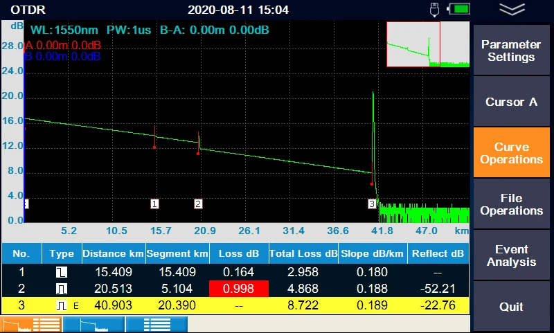 3) análisis OTDR fácil de entender con lista de eventos