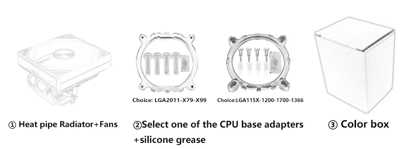 Paquete: Caja de color (refrigerador de CPU*1, soporte de fijación*1 kit, grasa de silicona*1)