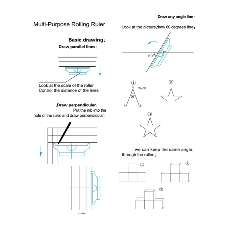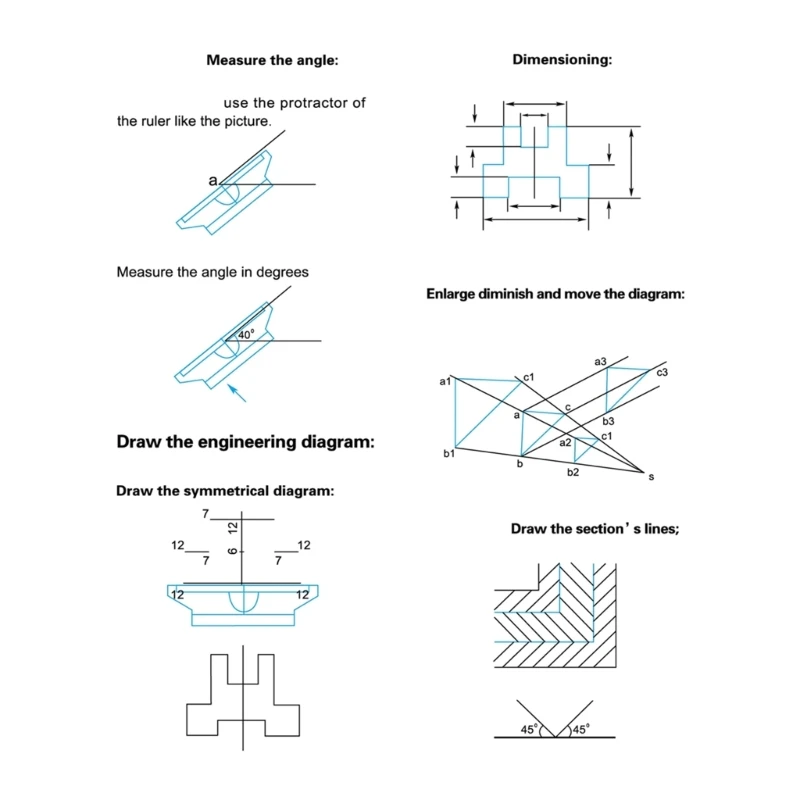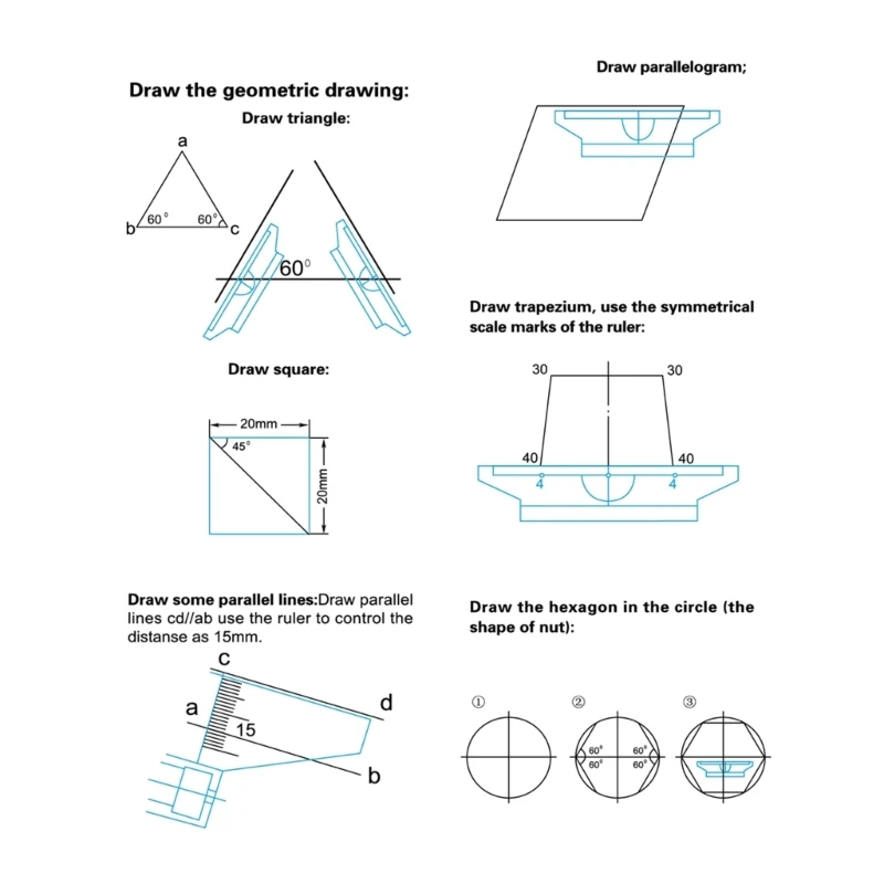 Regla universal y transportador para dibujar la figura deseada, también puede dibujar curvas, líneas paralelas horizontales, líneas paralelas verticales, etc.