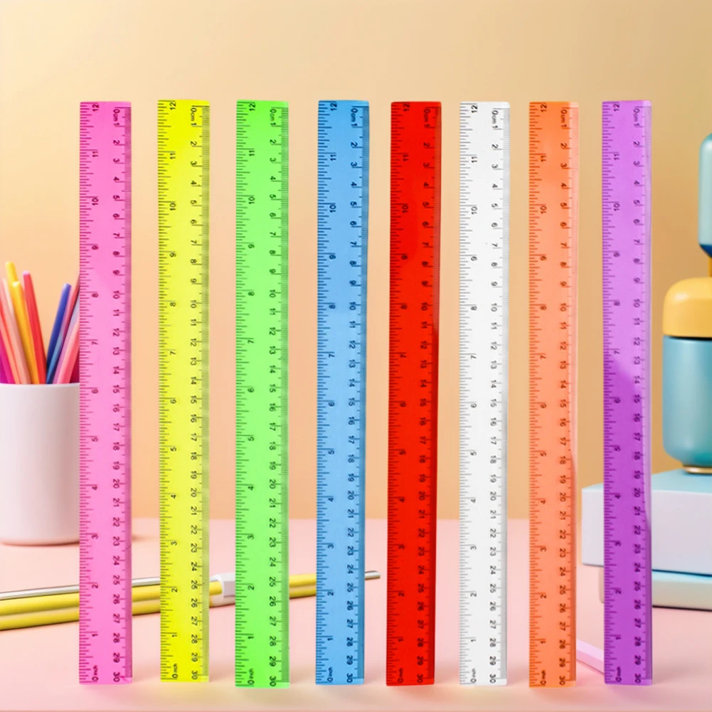 3. Múltiples colores con bordes lisos:Disponibles en una variedad de colores, estas reglas de dibujo de plástico presentan bordes lisos y tamaños estándar, lo que las hace perfectas para niños y estudiantes con fines educativos.