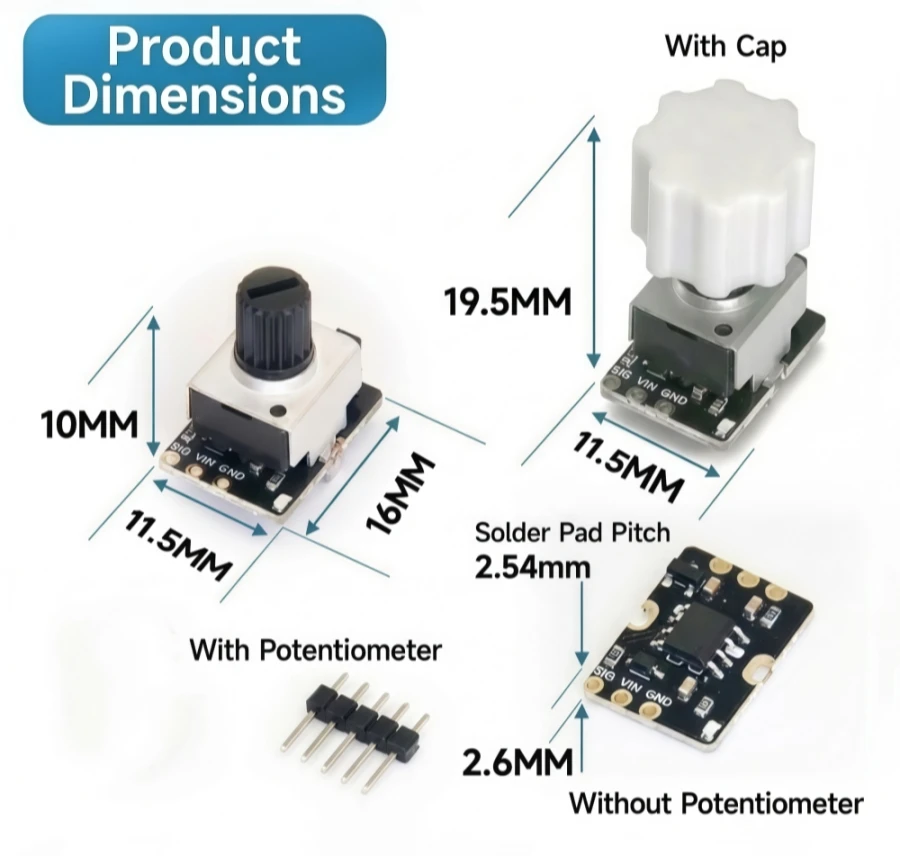 16 × 11,5 × 19,5 mm (con potenciómetro y tapa)