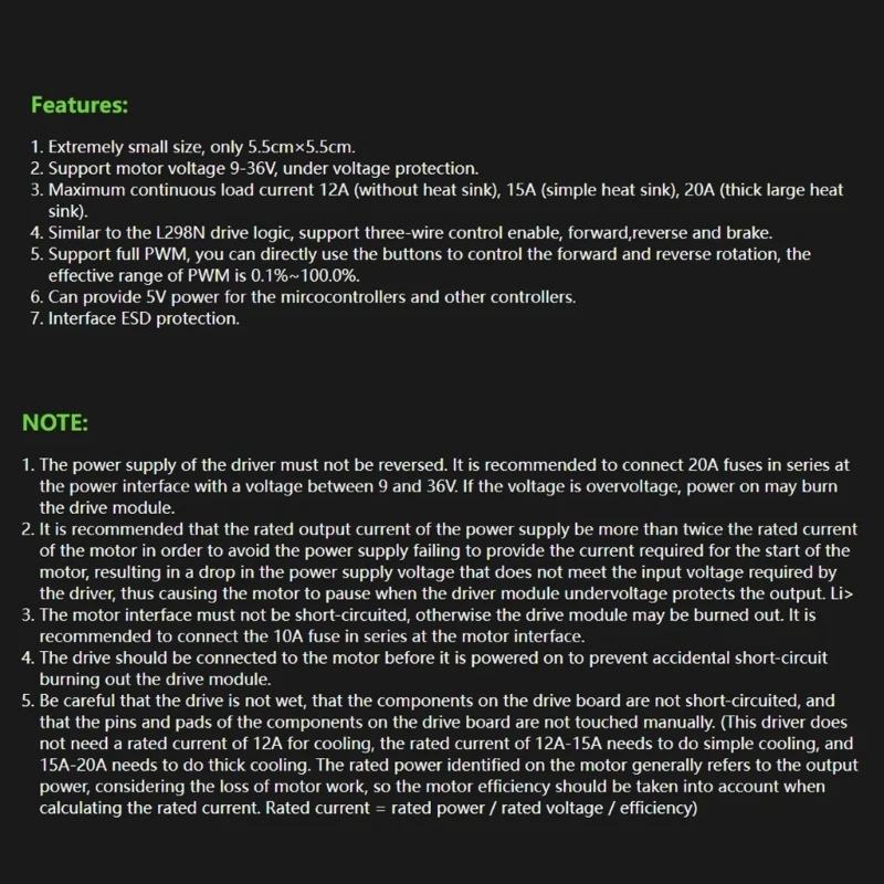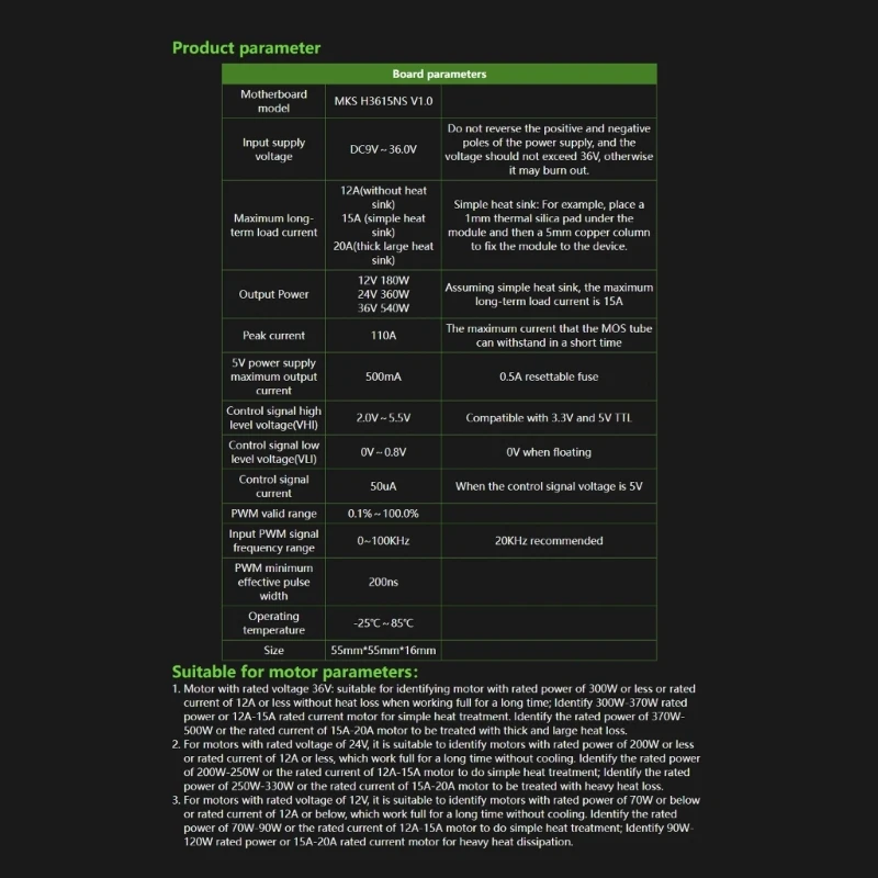 Características:OotdtyPotente salida, la placa controladora de un solo canal H3615NS 36V/15A proporciona una salida de potencia robusta de hasta 540W, lo que garantiza un rendimiento eficiente para sus dispositivos.