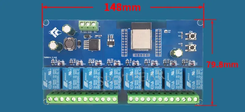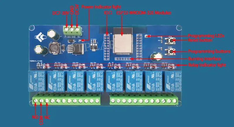 [] 6.La placa tiene 8 relés de 5 V que emiten señales de interruptor de salida, adecuados para controlar cargas con un voltaje de funcionamiento inferior a AC250V/DC30V;