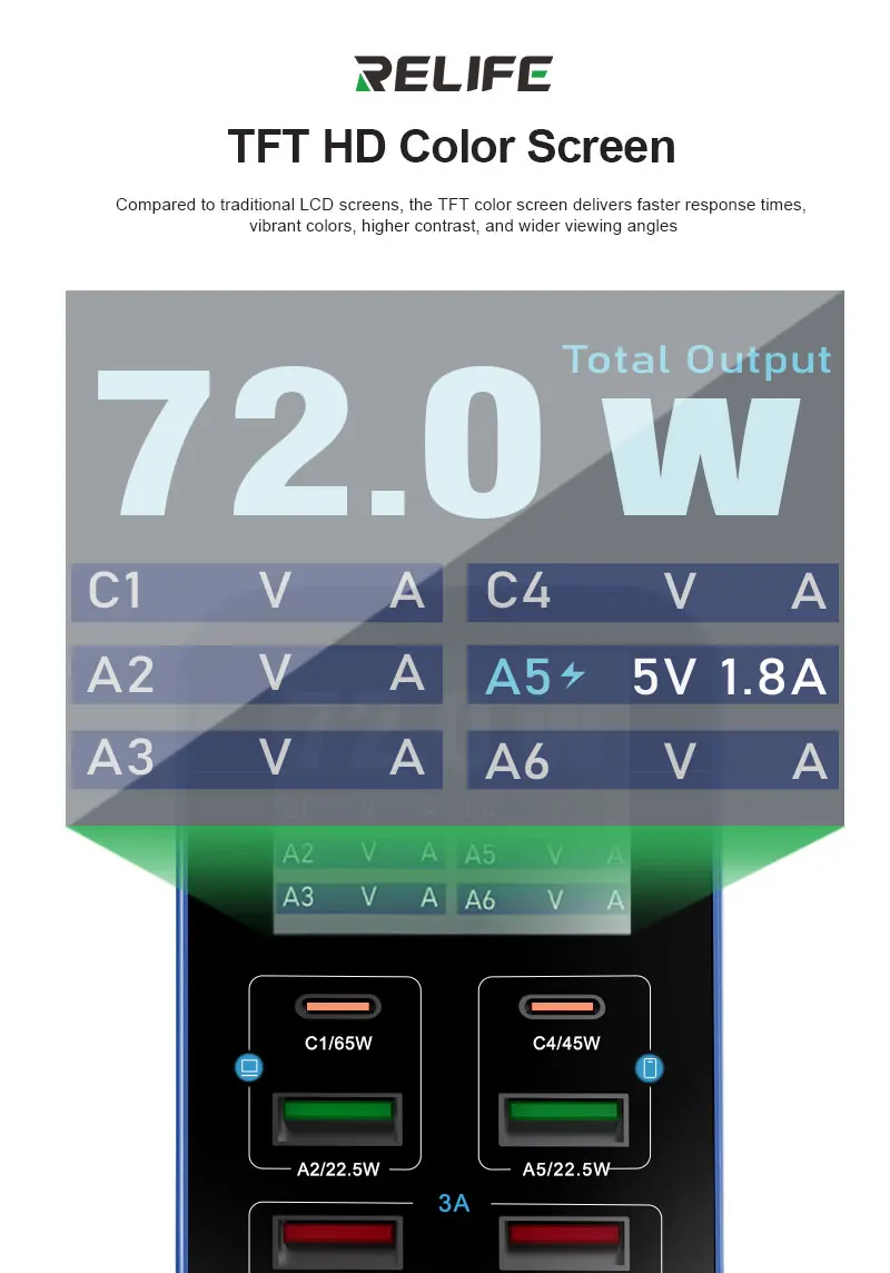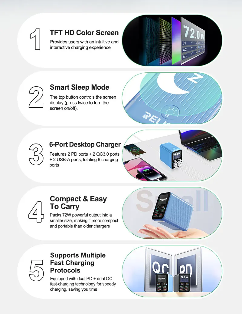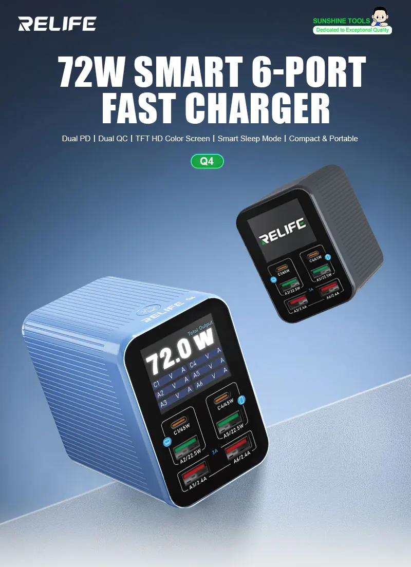 RELIFE Q4 72W cargador rápido inteligente de 6 puertos interfaz USB/TYPE PD QC para teléfonos móviles tabletas auriculares reparación herramientas de carga rápida