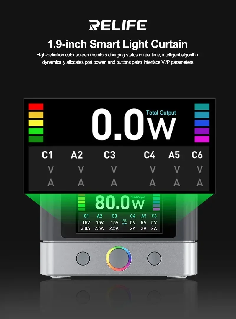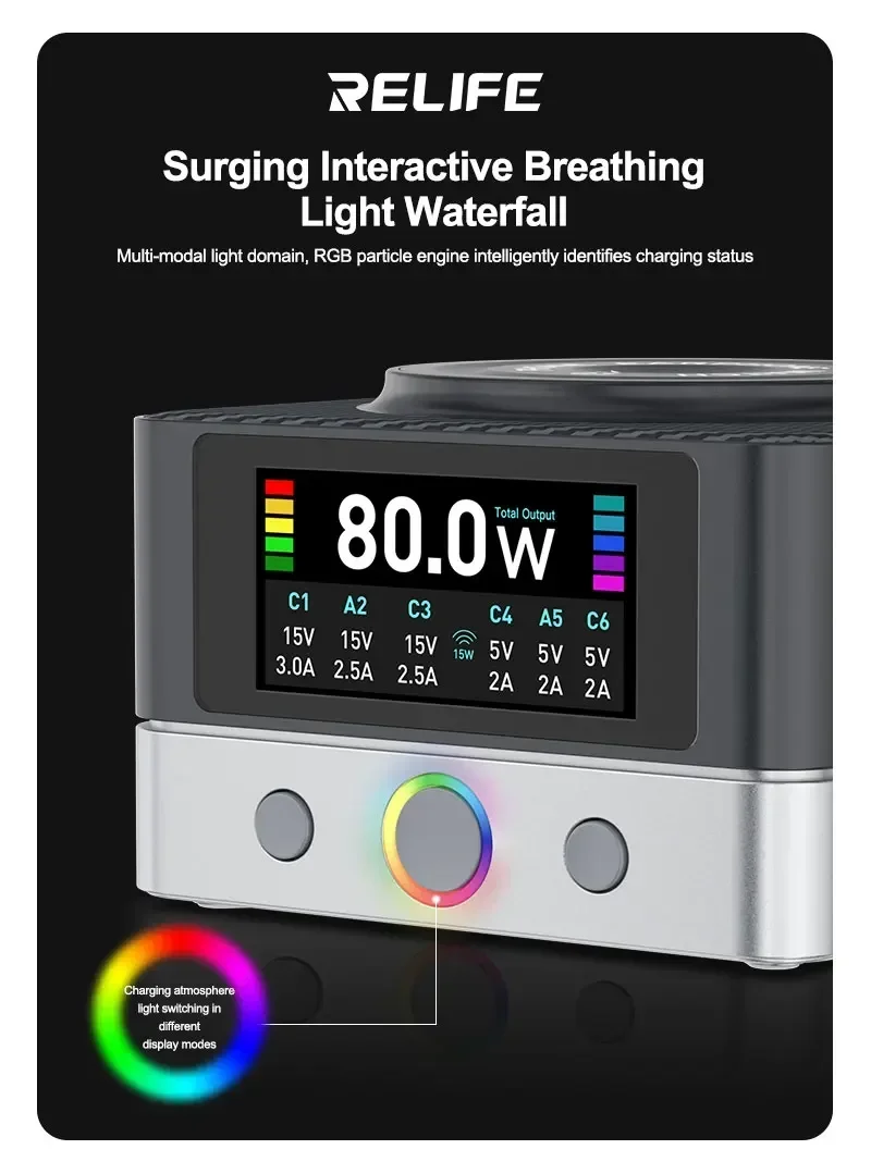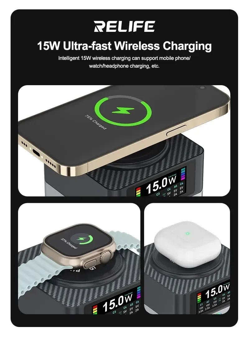 RELIFE Q7 Cargador inteligente de 6 puertos para dispositivos electrónicos Estación de carga inalámbrica ultrarrápida de 15 W para herramientas de tableta y teléfono