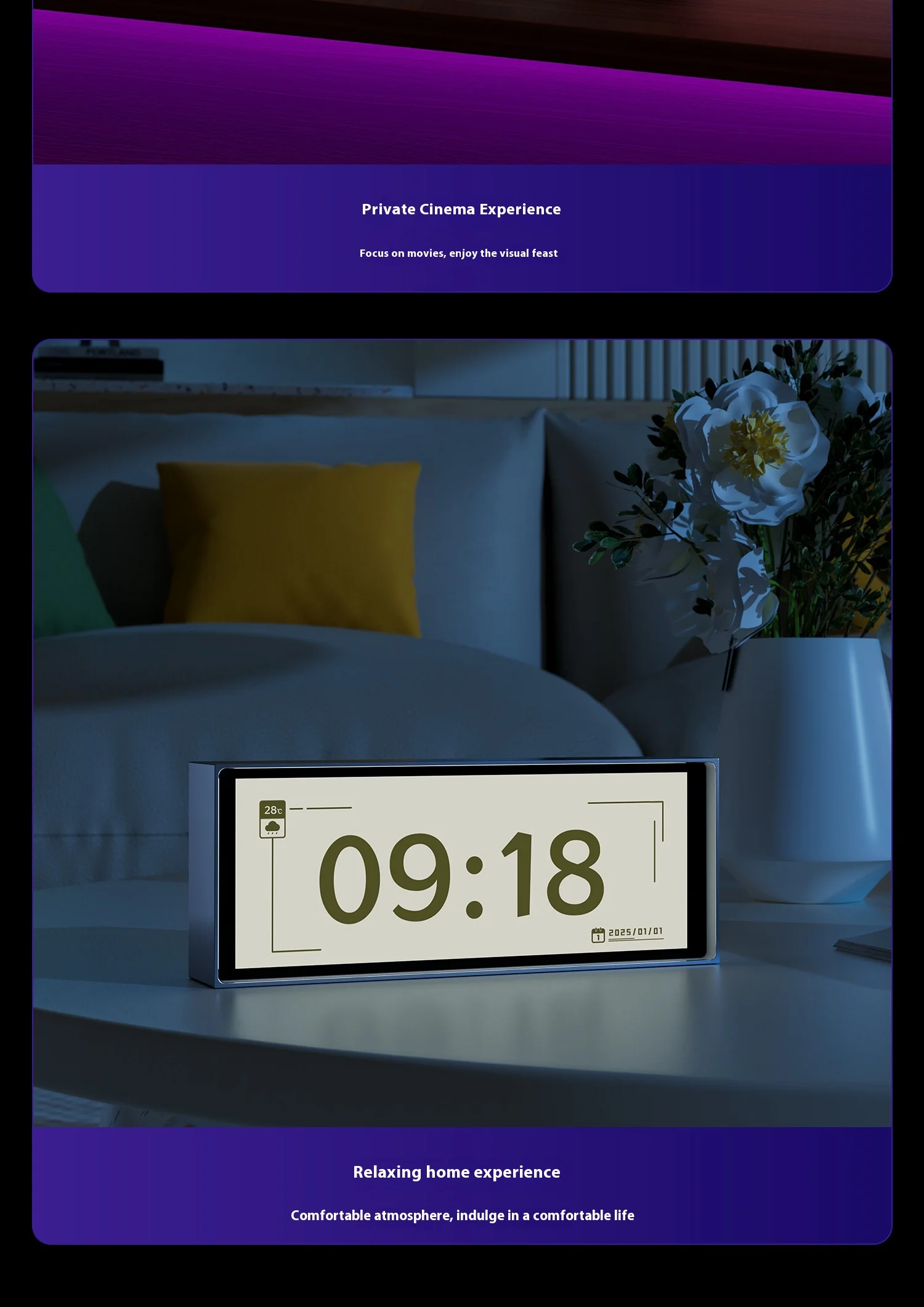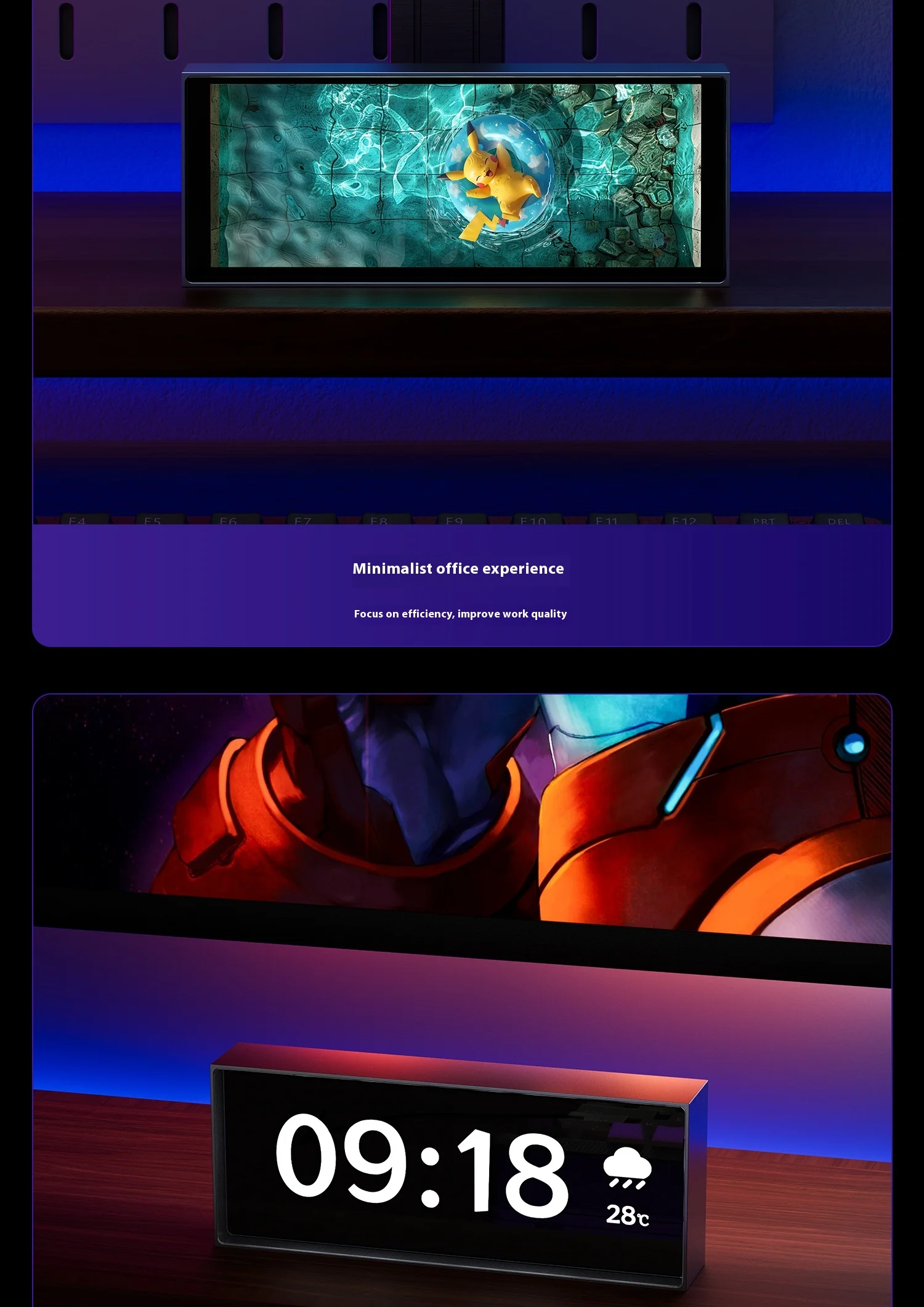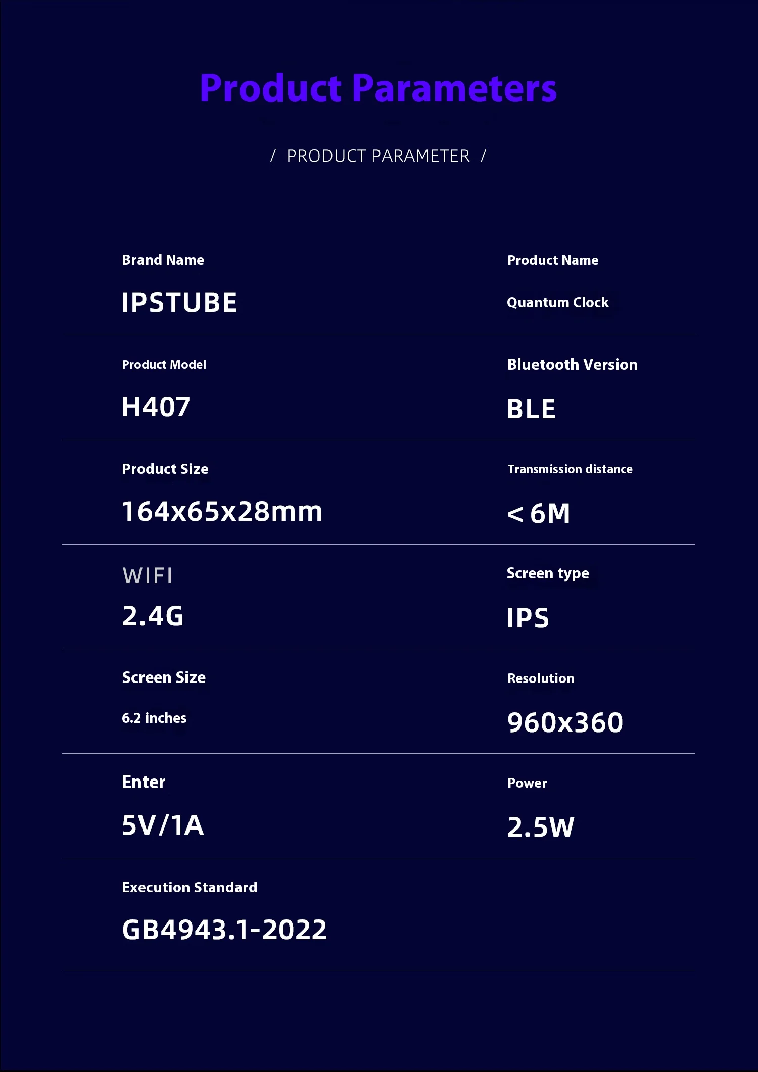 Nombre de marca: IPSTUBE Modelo de producto: H407 Tamaño del producto: 164x65x28mm WIFI: 2,4G Tamaño de la pantalla: 6,2 pulgadas Entrada: 5V/1A Nombre del producto: Reloj cuántico Versión de Bluetooth: BLE Distancia de transmisión: 6M Tipo de pantalla: IPS Resolución: 960x360 Potencia: 2,5W