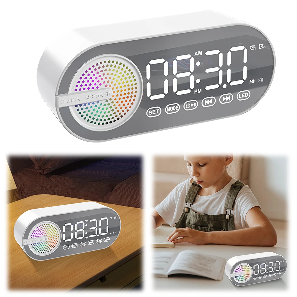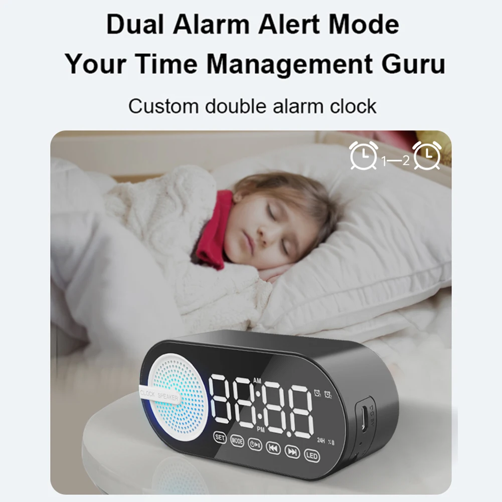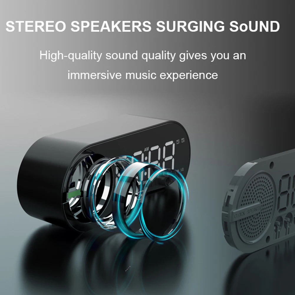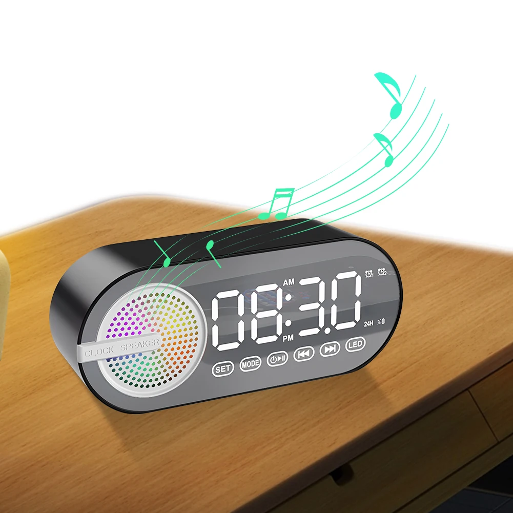 5. Diseño elegante:Equilibrando estilo y función, este reloj despertador con altavoz BT añade un toque de elegancia a cualquier habitación.Su diseño elegante y compacto cabe fácilmente en mesitas de noche, escritorios o estantes, combinando perfectamente con cualquier decoración.La pantalla LED garantiza una visibilidad clara incluso en condiciones de poca luz.