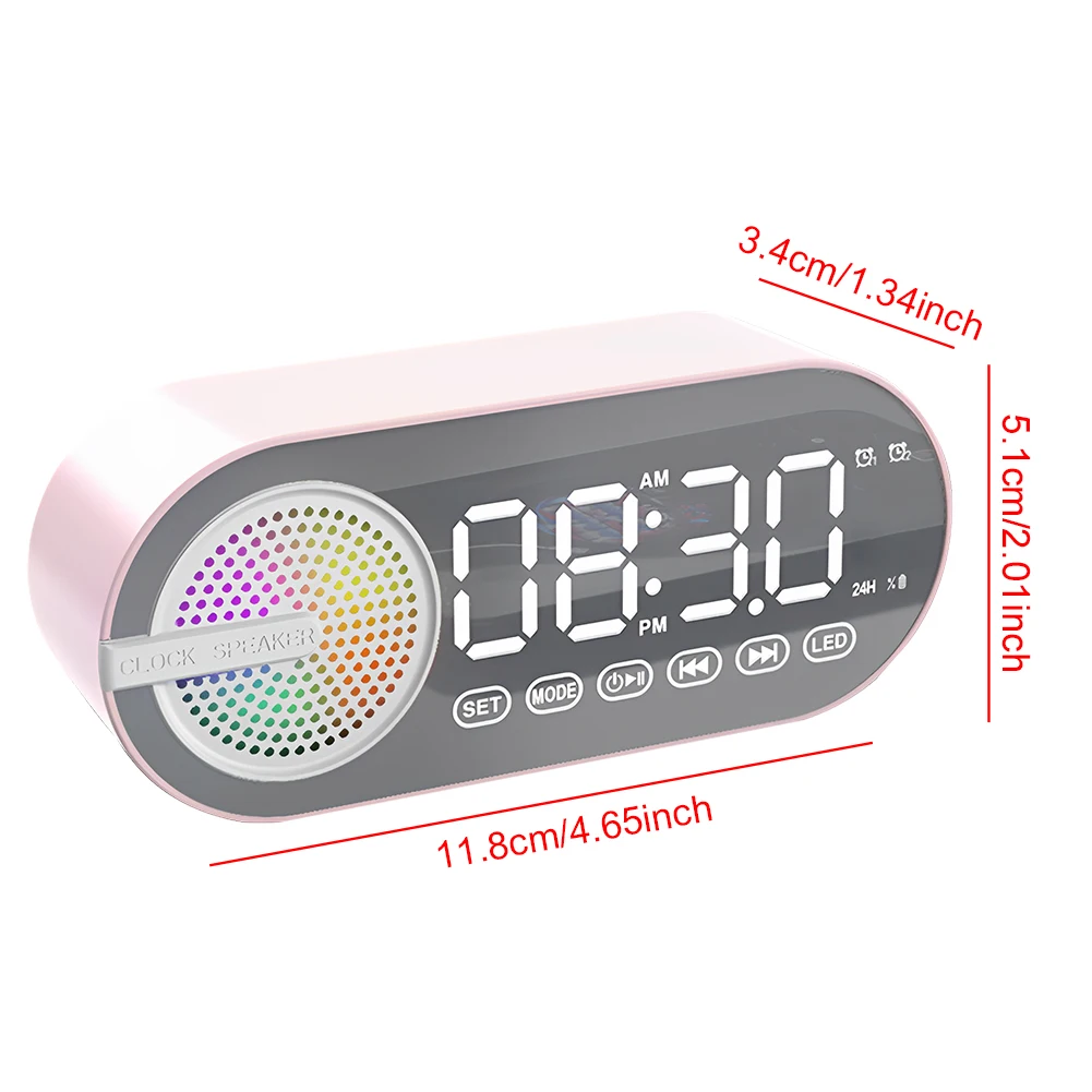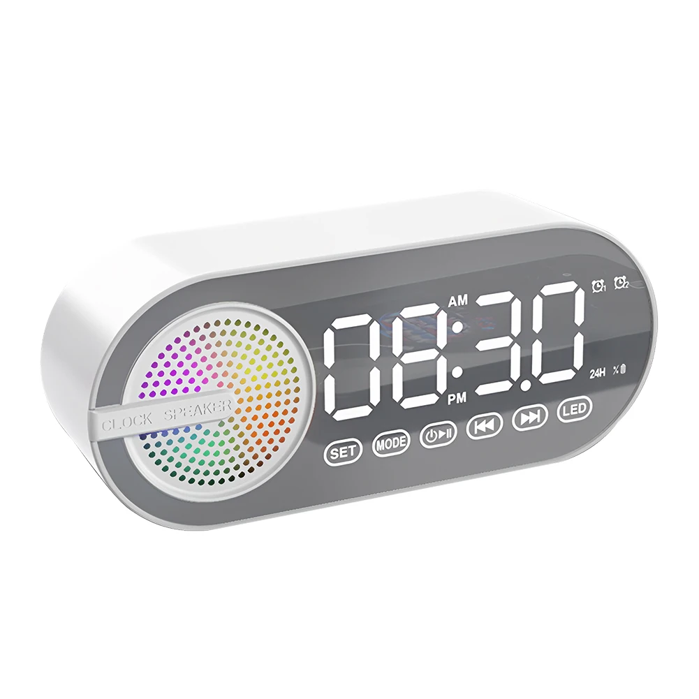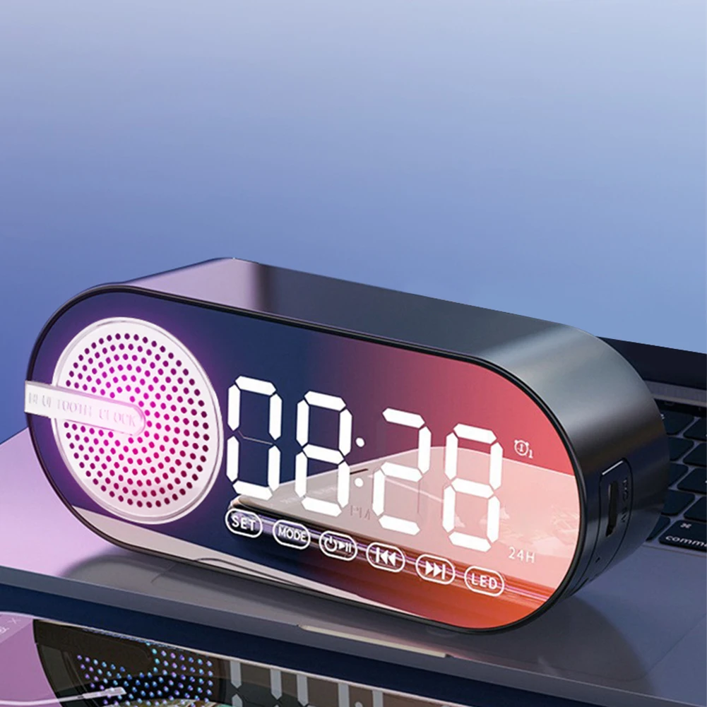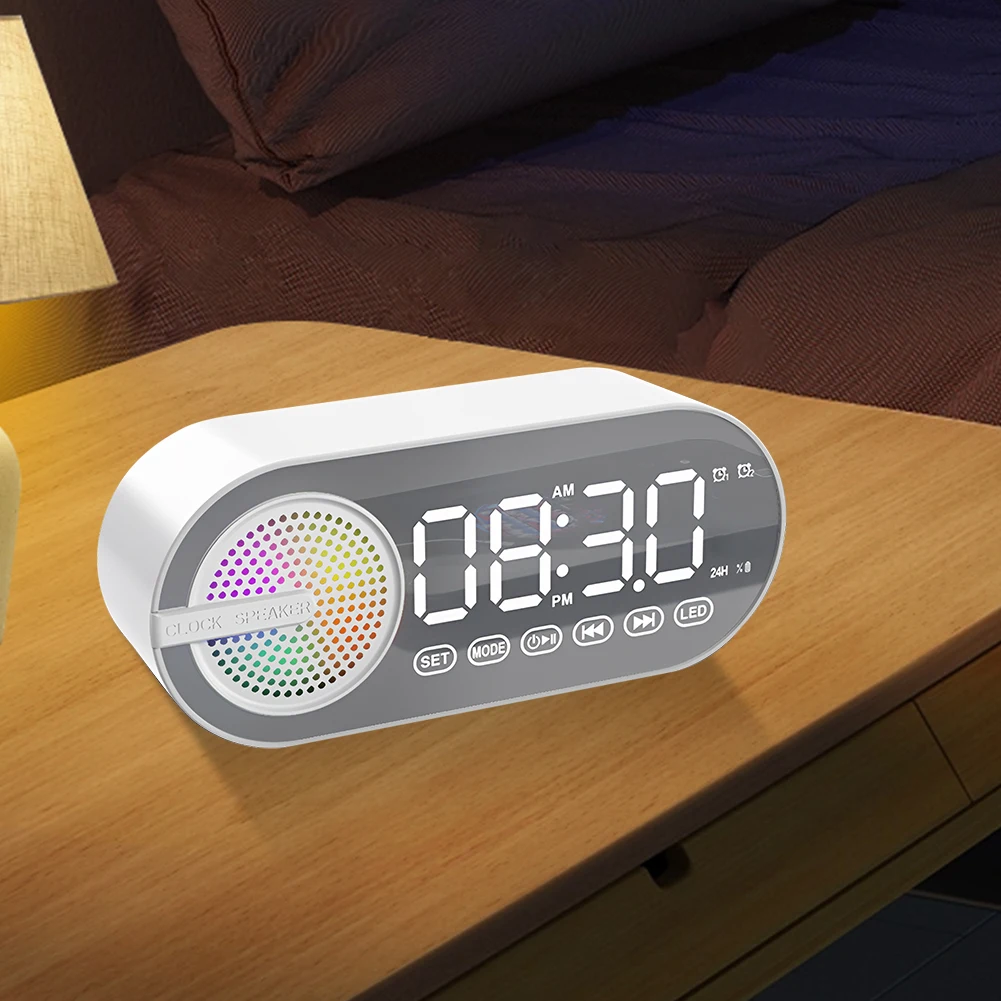 5. Diseño elegante:Equilibrando estilo y función, este reloj despertador con altavoz BT añade un toque de elegancia a cualquier habitación.Su diseño elegante y compacto cabe fácilmente en mesitas de noche, escritorios o estantes, combinando perfectamente con cualquier decoración.La pantalla LED garantiza una visibilidad clara incluso en condiciones de poca luz.