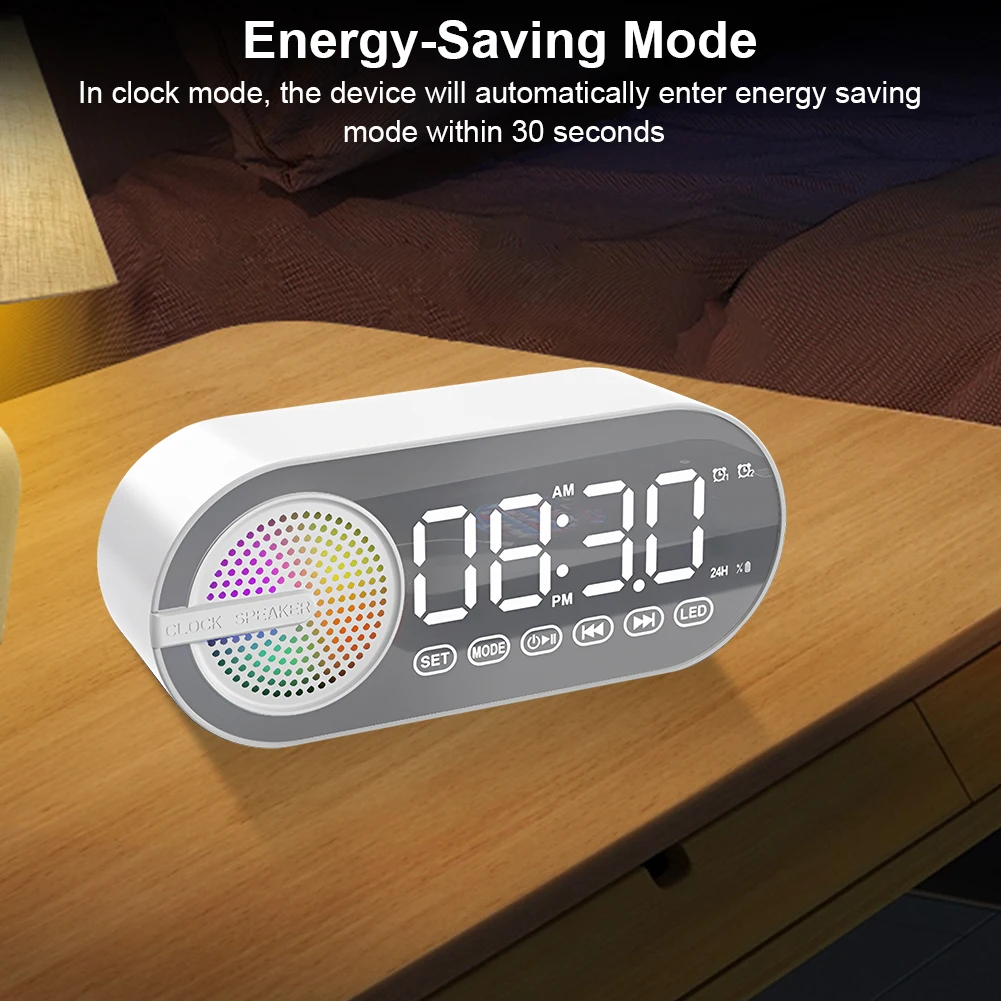 5. Diseño elegante:Equilibrando estilo y función, este reloj despertador con altavoz BT añade un toque de elegancia a cualquier habitación.Su diseño elegante y compacto cabe fácilmente en mesitas de noche, escritorios o estantes, combinando perfectamente con cualquier decoración.La pantalla LED garantiza una visibilidad clara incluso en condiciones de poca luz.