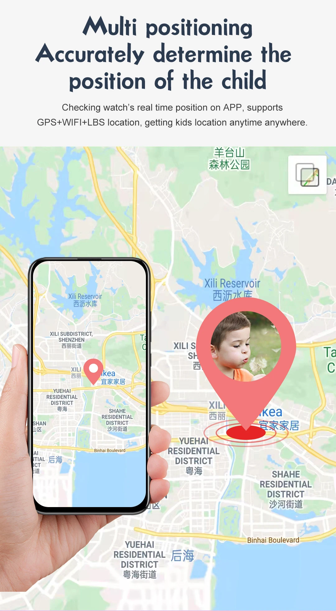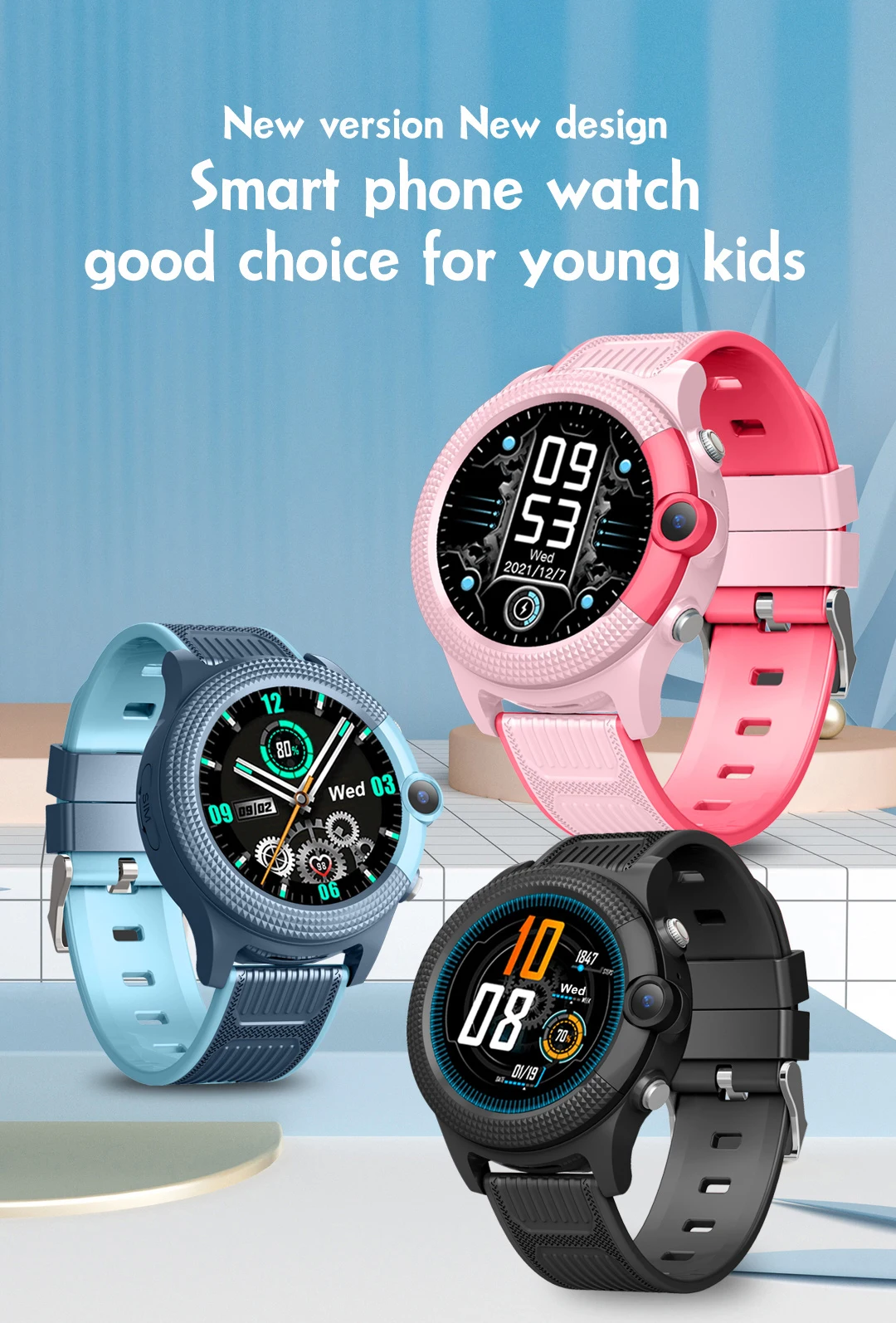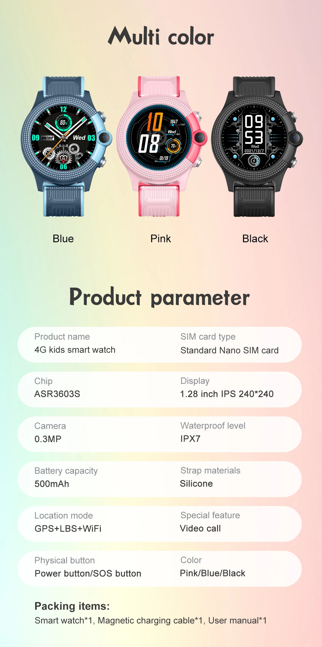 Nombre del producto: Reloj inteligente 4G para niños (versión de bajo consumo de energía)Material: ABS+PC+silicona suaveConjunto de chips principal: ASR3603SConjunto de chips GPS: incorporadoSistema operativo: RTOSMemoria del sistema: RAM 128Mb + ROM 196MbRanura para tarjeta SIM: Ranura para tarjeta Nano SIMBandas de frecuencia:"FDD: B1 B2 B3 B5 B7 B8 B20WCDMA: B1 B2 B5 B8GSM: B2 B3 B5 B8"Modo de ubicación: GPS+LBS+WiFiPrecisión de ubicación GPS: 5-15 mPrecisión de ubicación WIFI: 50-100 mPrecisión de ubicación LBS: 100-1000 mAntena LTE/GPS: internaBatería: batería de polímero incorporada de 500 mAhTipo de cable: cable de carga magnéticoPantalla de visualización: pantalla táctil a color IPS de 1,28 pulgadas, 240*240 píxelesBotón físico: botón de encendido (SOS)Cámara: 0,3 megapíxelesOpciones de color: azul/rosa/negro