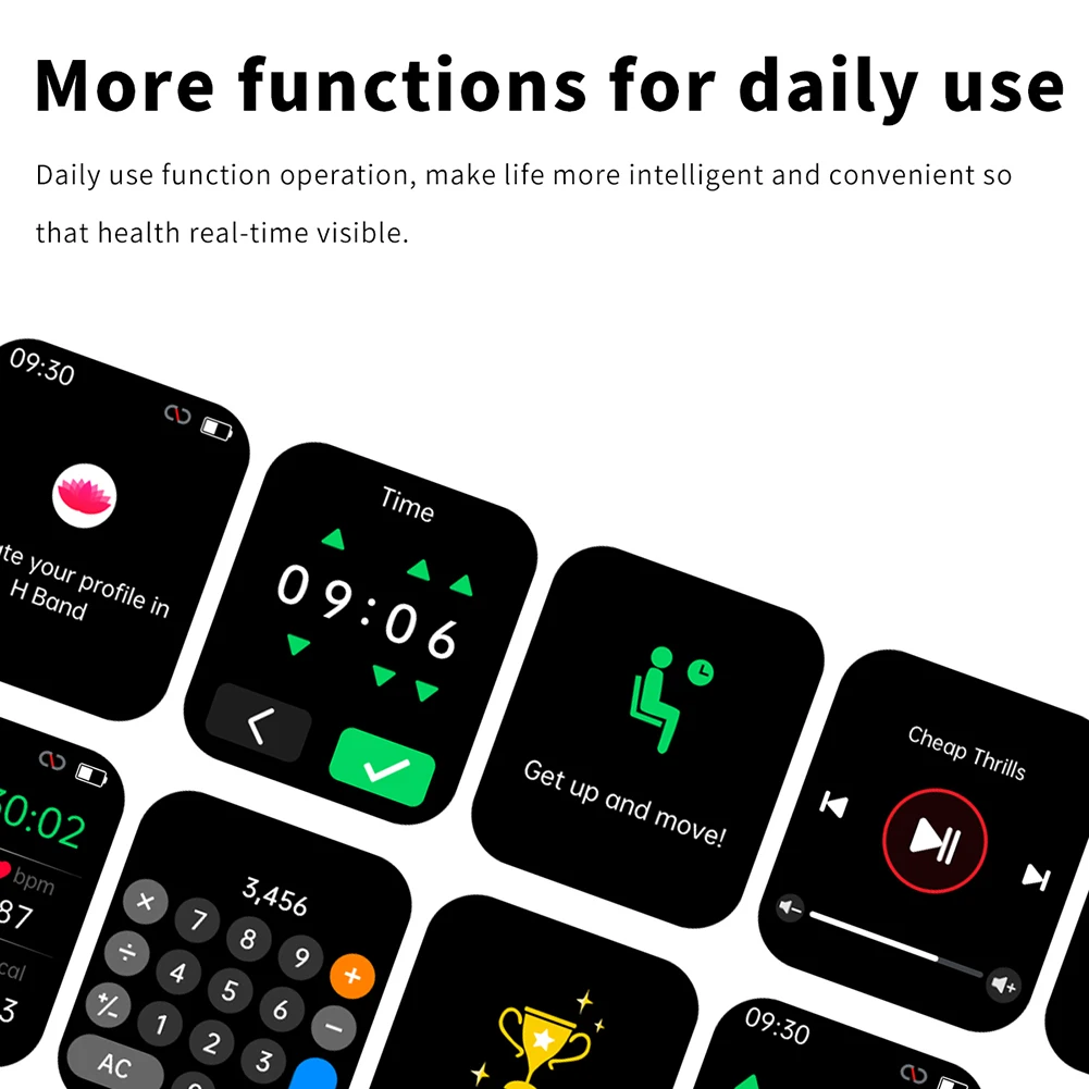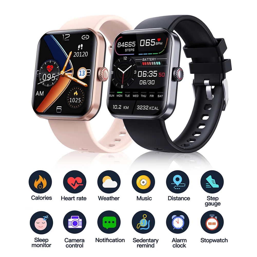 Conteo de pasos, distancia, calorías, frecuencia cardíaca, oxígeno en sangre, presión arterial, azúcar en sangre, pruebas de temperatura corporal, reproducción de música de monitoreo del sueño, cronómetro, cuenta regresiva, calculadora, pantalla meteorológica, función de período fisiológico femenino, fotografía de control remoto, levantamiento de muñeca e iluminación de pantalla, búsqueda de teléfonos móviles, etc.