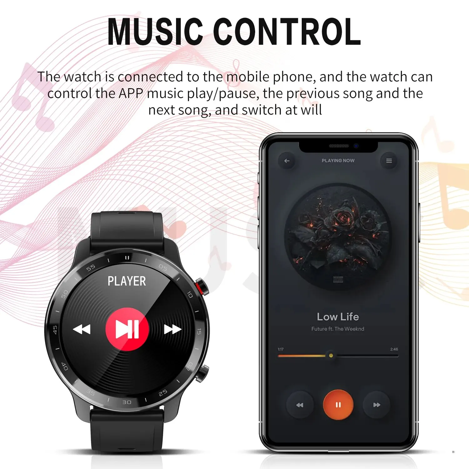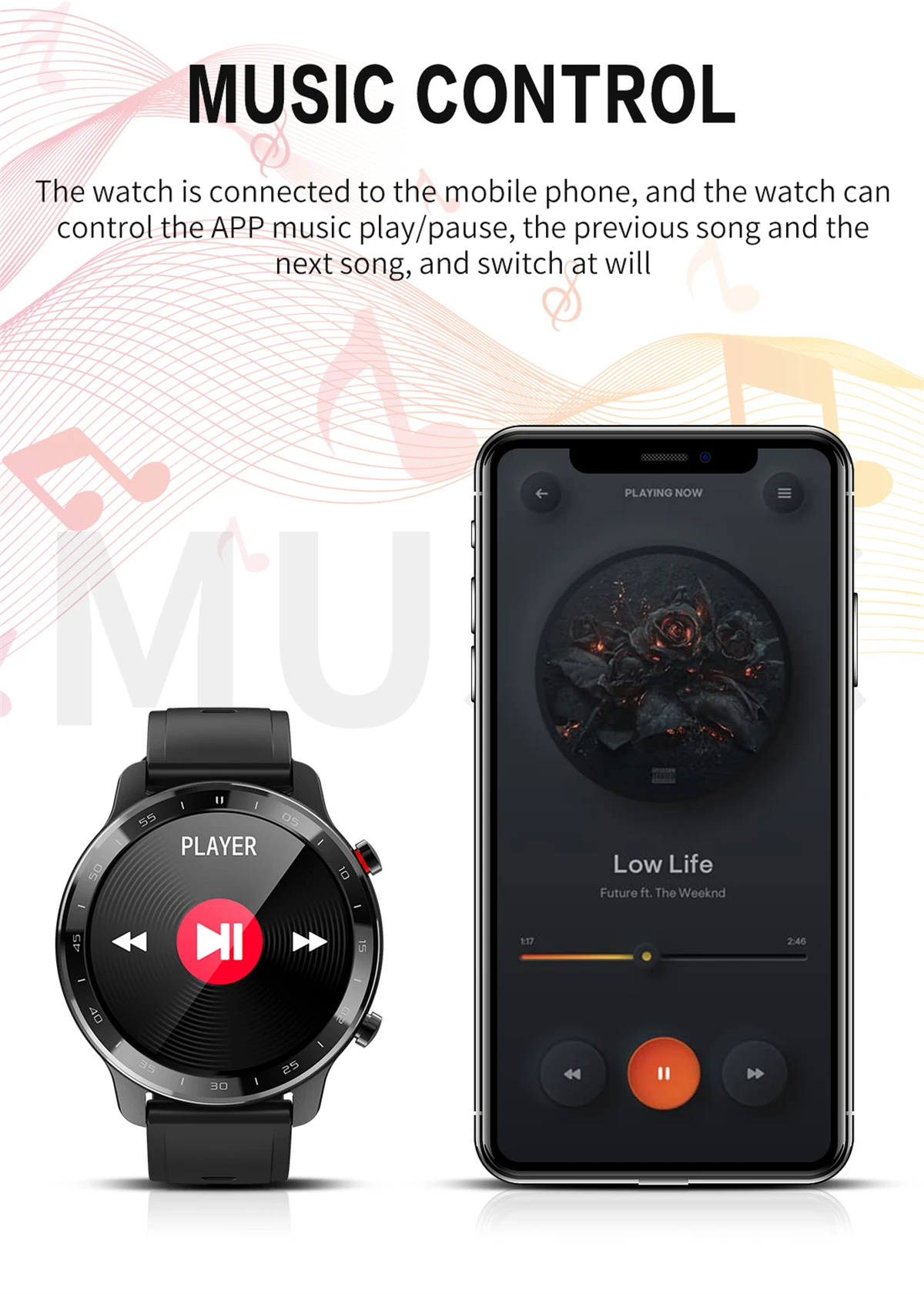 El reloj está conectado al teléfono móvil y puede controlar la reproducción/pausa de música de la aplicación, la canción anterior y la siguiente canción, y cambiar a voluntad.
