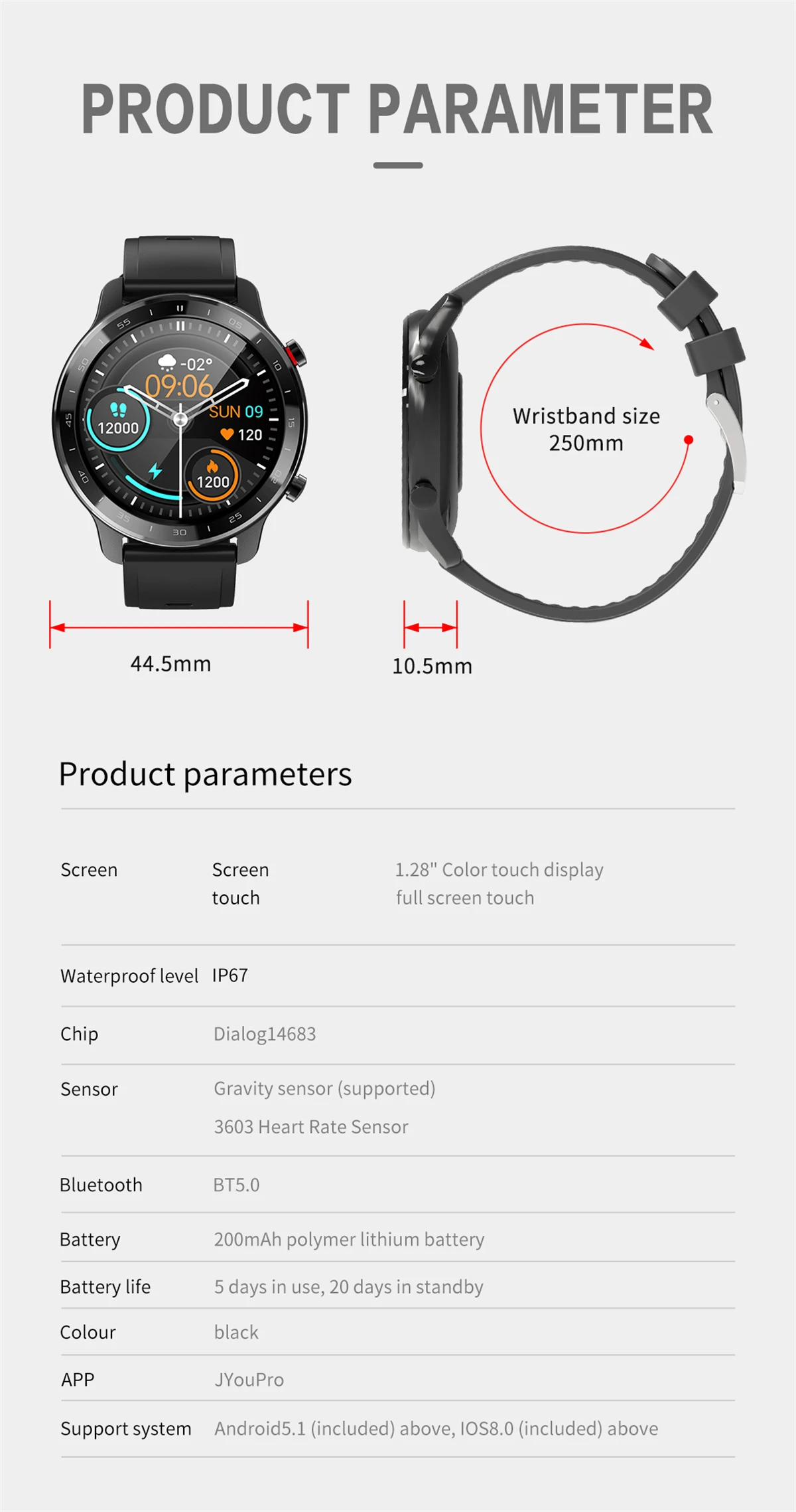 Tamaño de la pulsera: longitud total 245 mm, longitud ajustable 155-225 mm