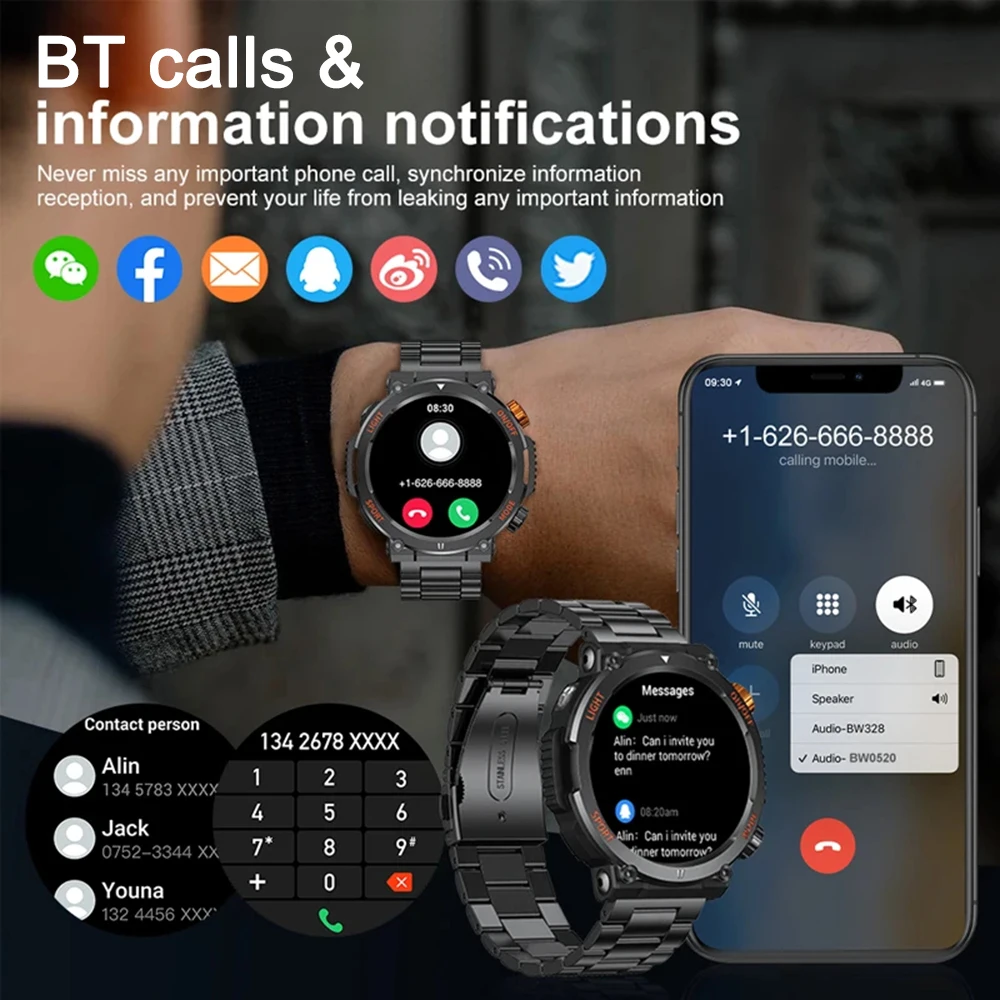 3. Los relojes inteligentes deportivos para hombres y mujeres, después de conectarse a Bluetooth, pueden recibir y recibir todas las notificaciones (para SMS, para Facebook, para WhatsApp, para Twitter, para Instagram, para Gmail, etc.) conectado directamente a tu reloj de seguimiento de salud. Al mismo tiempo, el reloj inteligente admite marcación por Bluetooth, respuesta de llamadas, función de reducción de ruido IMC, lo que hace que la calidad del sonido sea más texturizada, haciendo escenarios de ejercicio diario donde es incómodo sostener un teléfono de manera más simple e inteligente.