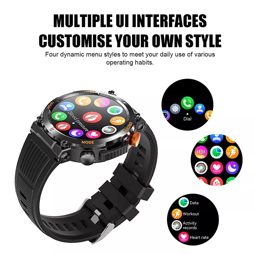 1. Material compuesto especial, cerrado por metal de aleación de aluminio, lo que lo hace más resistente y duradero. Compatible con el uso en condiciones ambientales adversas, como resistencia al calor, resistencia al frío, resistencia a la humedad y resistencia a las caídas. Certificación internacional, a través de la certificación estándar, nuestros relojes inteligentes para hombres garantizan que los utilices con confianza en diversas condiciones difíciles. Muy adecuado para actividades al aire libre.