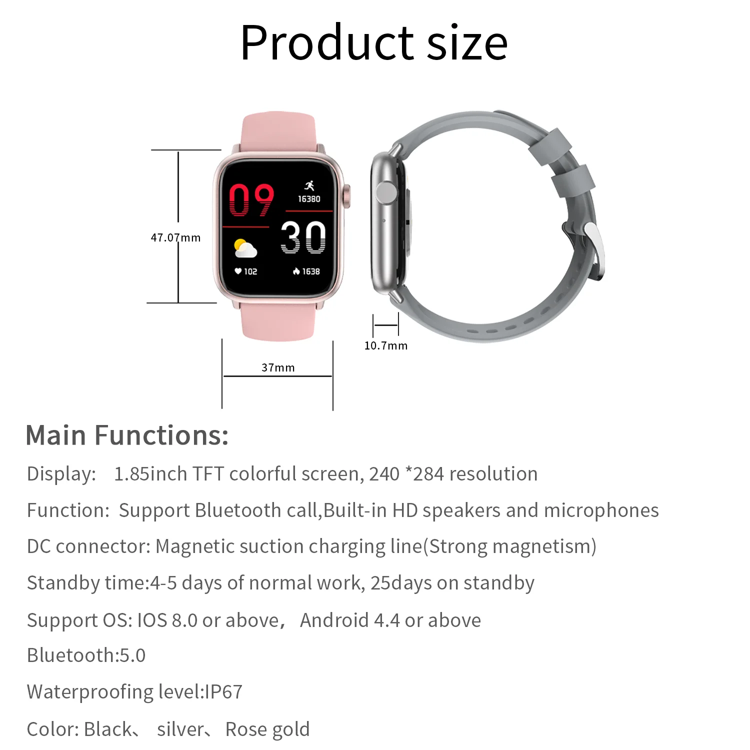 Marque Mercado, conexión de código de escaneo, múltiples juegos de menú de interfaz de usuario, llamada de voz, actualización OTA, conteo de pasos, calorías, modo de ejercicio, pantalla de luz de mano, monitoreo del sueño, recordatorio de llamada, recordatorio de SMS, recordatorio sedentario, recordatorio de despertador, cronómetro, interruptor de Dial, Dial dinámico 3D, reproducción de música, Entrenamiento de respiración, medición de todos los puntos, frecuencia cardíaca, presión arterial, oxígeno en sangre, calculadora, Dial personalizado, ajuste de nivel de luz, clima, reloj despertador independiente,