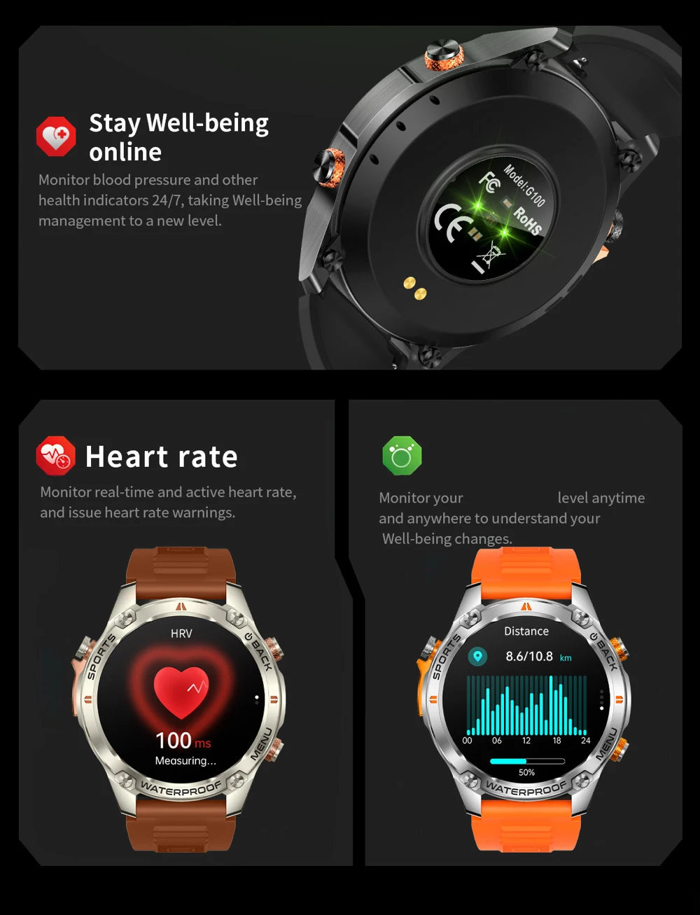 1.Wearable devices monitor human activities through electronic sensors. They are at the level of consumer electronics. It's normal to have certain deviation. The health test results of the watch are for reference only, and can not be compared with medical equipment. When the watch is placed on the surface of the object, there will be heart rate / blood pressure and other test results. It is normal and not a product defect.