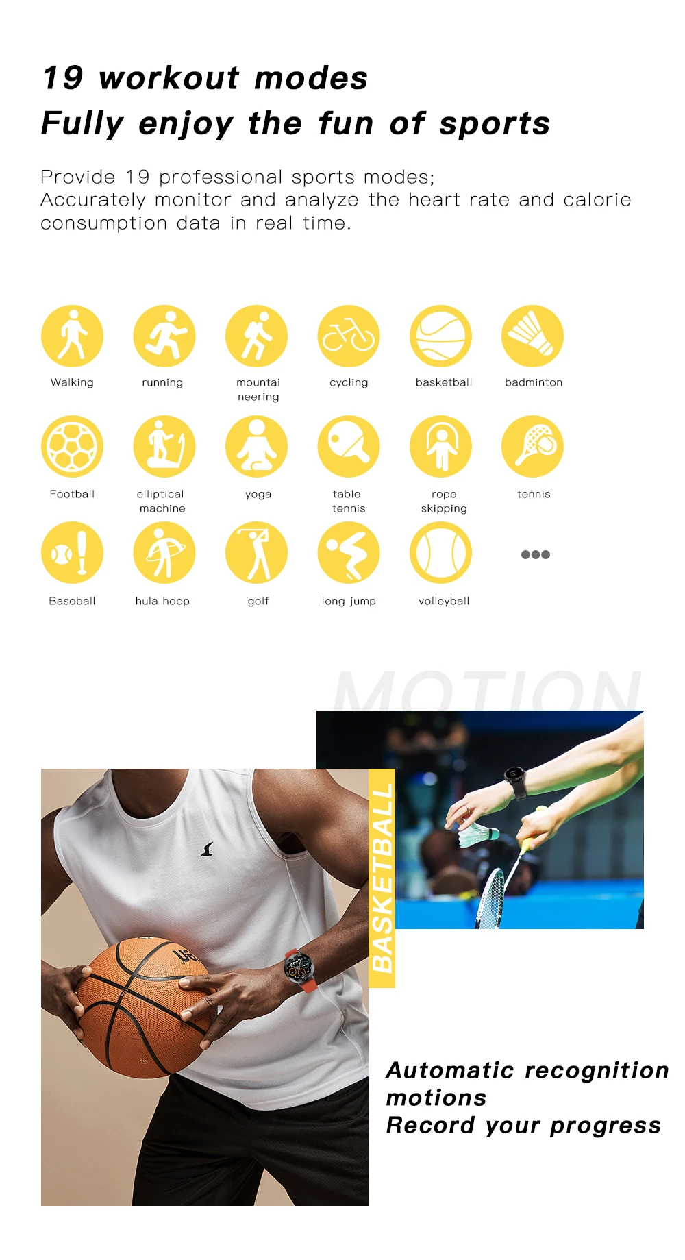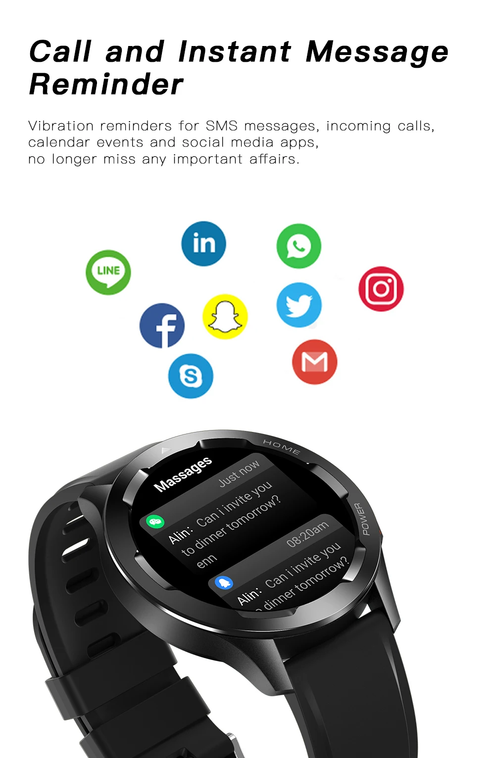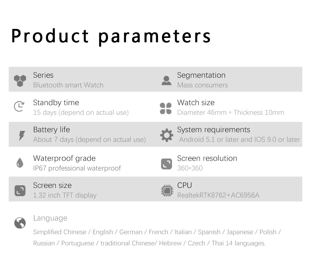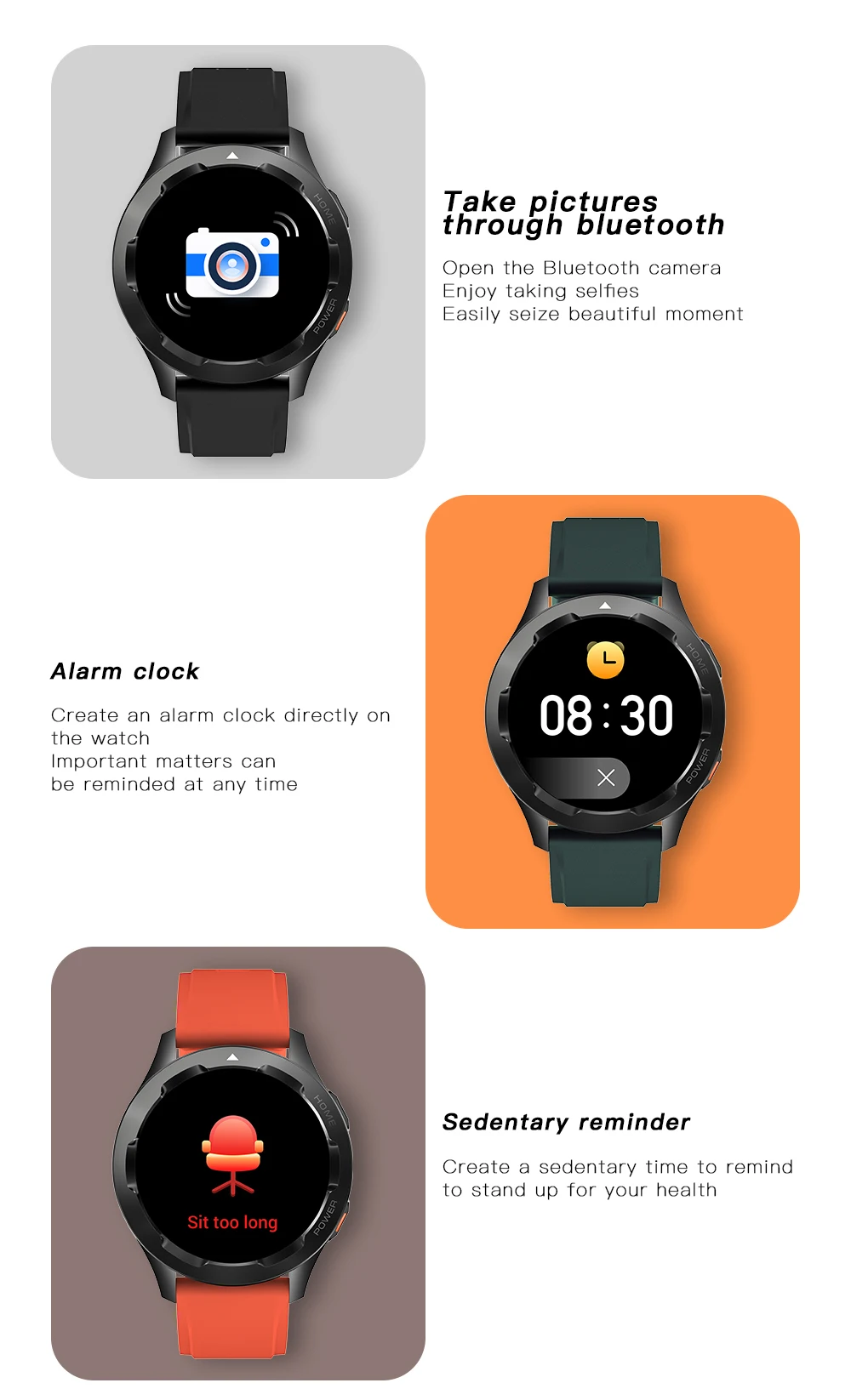 Pantalla de reloj, marcación múltiple, actualización de marcación, notificación de mensajes de aplicaciones móviles, recordatorio de llamadas, llamada Bluetooth, música Bluetooth, monitor de frecuencia cardíaca, medición de presión arterial/oxígeno, podómetro, monitoreo del sueño, modo multideporte, alarma sedentaria, firmware multilingüe, otras funciones.