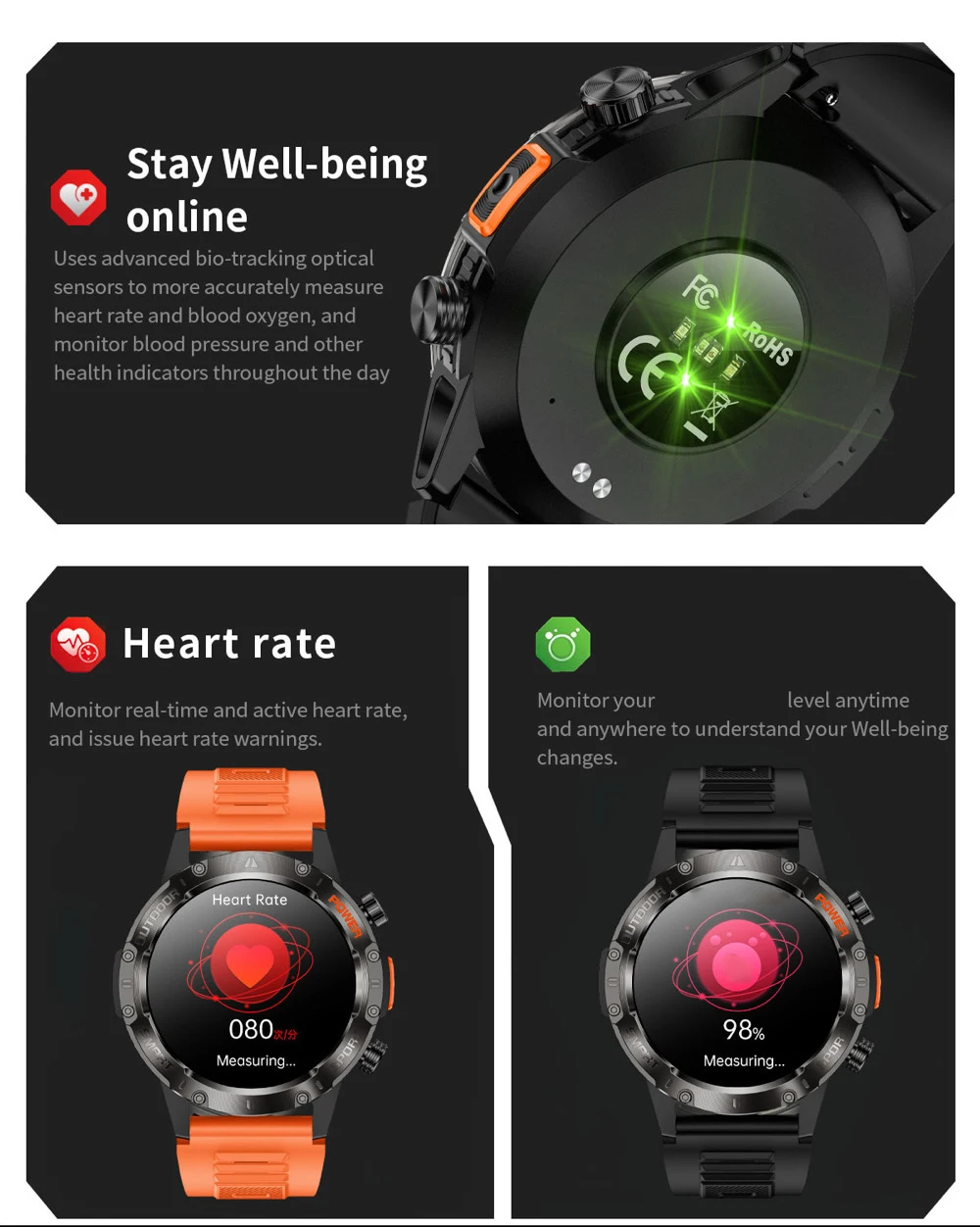 1. Los dispositivos portátiles monitorean las actividades humanas a través de sensores electrónicos.Están al nivel de la electrónica de consumo.Es normal que haya cierta desviación.Los resultados de las pruebas sanitarias del reloj son solo de referencia y no se pueden comparar con equipos médicos.Cuando el reloj se coloca en la superficie del objeto, habrá frecuencia cardíaca/presión arterial y otros resultados de pruebas.Es normal y no es un defecto del producto.