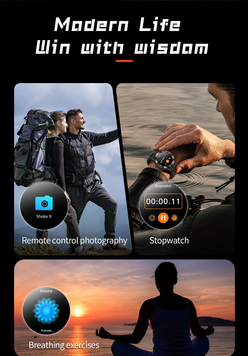 Otras funciones: dial, contactos, historial de llamadas, clima, hora y fecha, despertador, cronómetro, temporizador, interruptor de audio, linterna, modo no molestar, ajuste de brillo, duración de la pantalla, buscar teléfono, levantar la muñeca para encender la pantalla, apagar la pantalla, reproducir música, control de cámara, MET, entrenamiento de respiración, descarga de aplicaciones, restablecimiento de fábrica, etc.