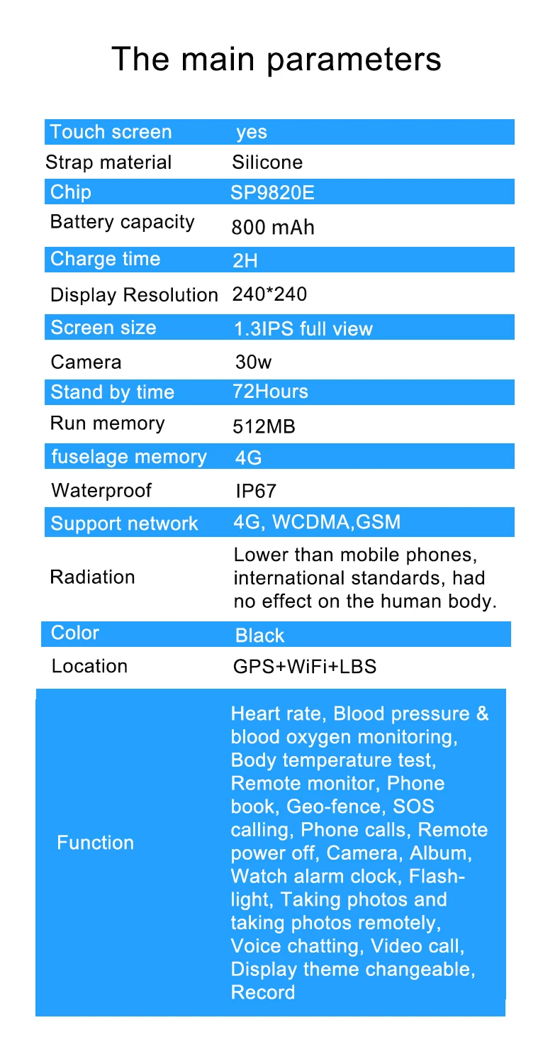 9. Alarma de detección de caídas, frecuencia cardíaca, oxígeno en sangre, temperatura corporal, cámara HD, botón SOS, seguimiento de huellas, zona de seguridad, podómetro, despertador, recordatorio de sedentarismo, linterna, fotos remotas.