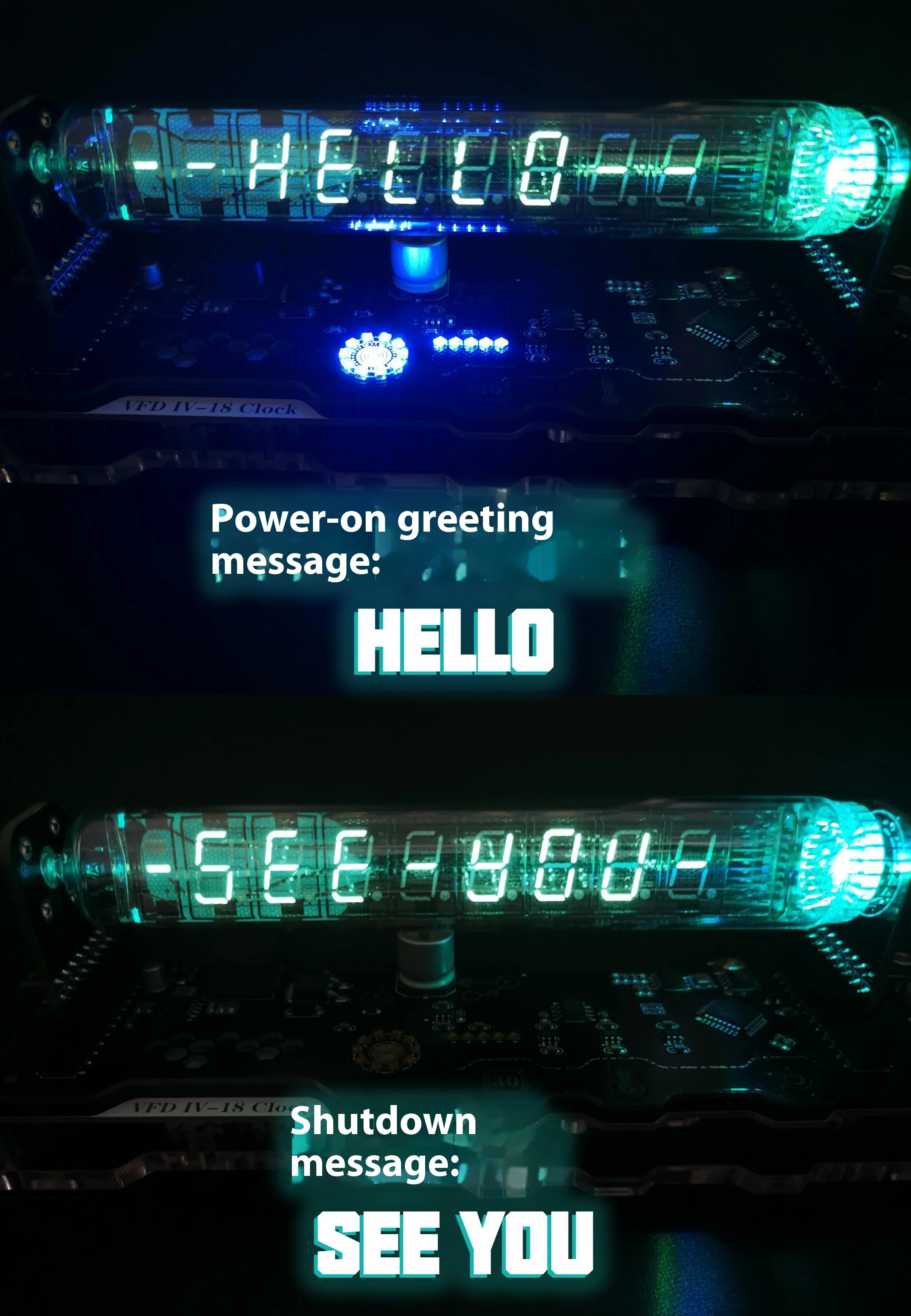 Saludo de inicio "HELLO" cuidadosamente diseñado y saludo de apagado "VERLO"!