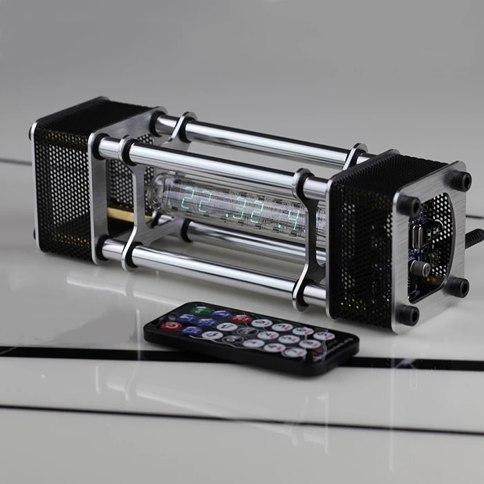 El VFD Nixie Clock de Energy Pillar utiliza los auténticos tubos rusos 1V-18 VFD producidos en los años 1980 a 1990. Al igual que nuestros Muchos otros diseños, el pilar de energía está revestido con un acabado de metal de calidad y está repleto de características que incluyen Brillo automático, función de suspensión, temporizador de Cuenta atrás y funciones de reloj despertador. El reloj también viene con un control remoto infrarrojo.