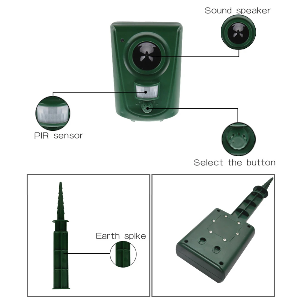 1.Tecnología ultrasónica avanzada:Ahuyenta eficazmente a los animales y plagas con este repelente ultrasónico para gatos.Emite frecuencias ultrasónicas potentes e irregulares que disuaden eficazmente incluso los animales más agresivos adaptados e inmune a un rango de frecuencia específico.