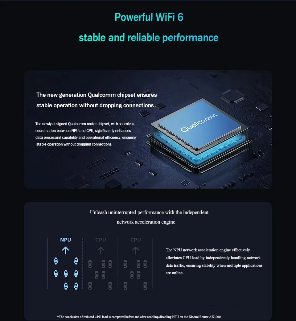 * Conclusión sobre la carga de CPU reducida en comparación con Xiaomi Router AX3000 antes y después de habilitar/deshabilitar NPU, procedente del 'Informe de prueba de rendimiento de Xiaomi Router AX3000 NPU' de Xiaomi Laboratory.