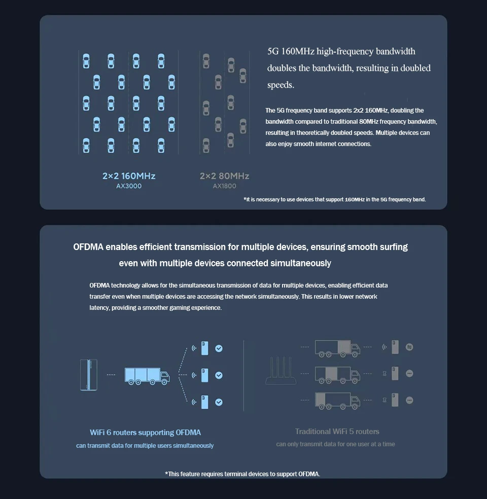 Los enrutadores WiFi 6 compatibles con OFDMA pueden transmitir datos para múltiples usuarios simultáneamente, mientras que los enrutadores WiFi 5 tradicionales solo pueden transmitir datos para un usuario a la vez.