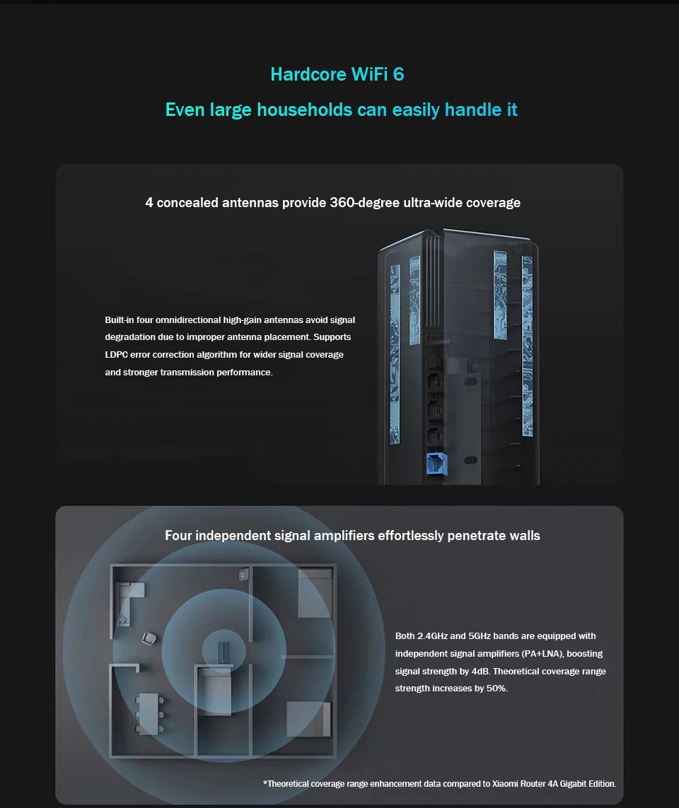 Tanto las bandas de 2,4 GHz como las de 5GHz están equipadas con amplificadores de señal independientes (PA + LNA), que aumentan la intensidad de la señal en 4dB. La fuerza del rango de cobertura teórica aumenta en un 50%.