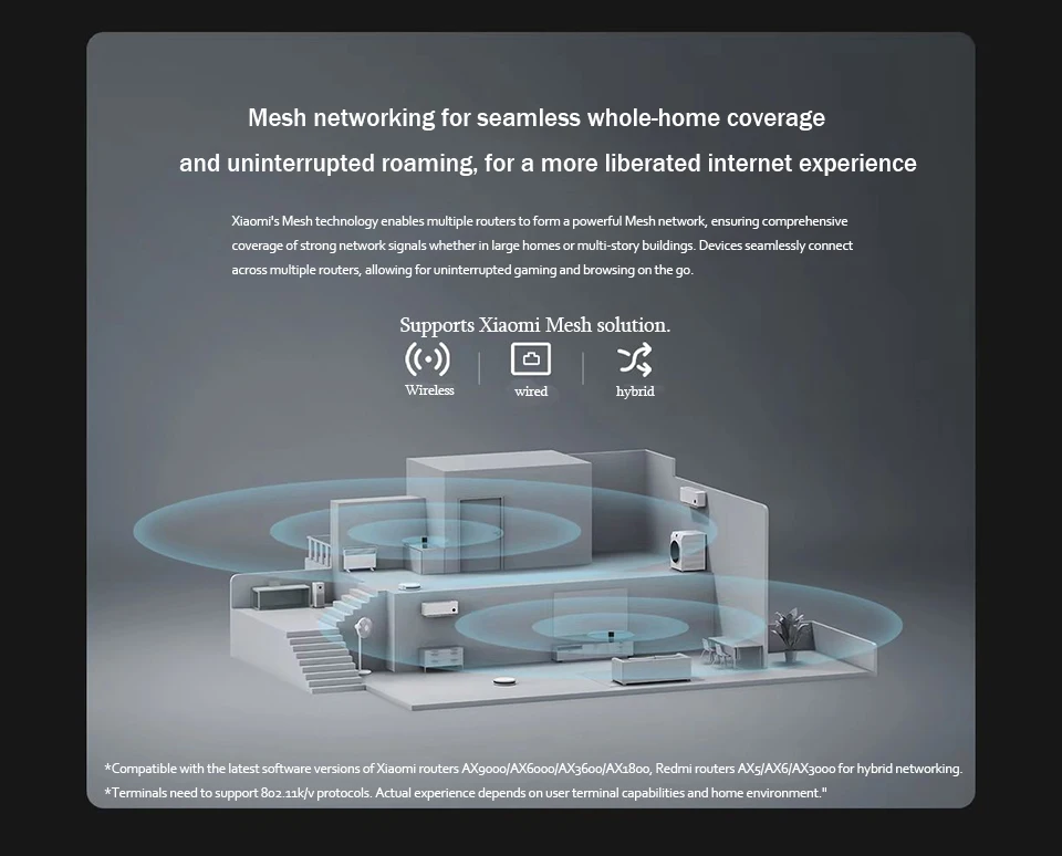 * Compatible con las últimas versiones de software de los routers Xiaomi AX9000/AX6000/AX3600/AX1800, routers Redmi AX5/AX6/AX3000 para redes híbridas.
