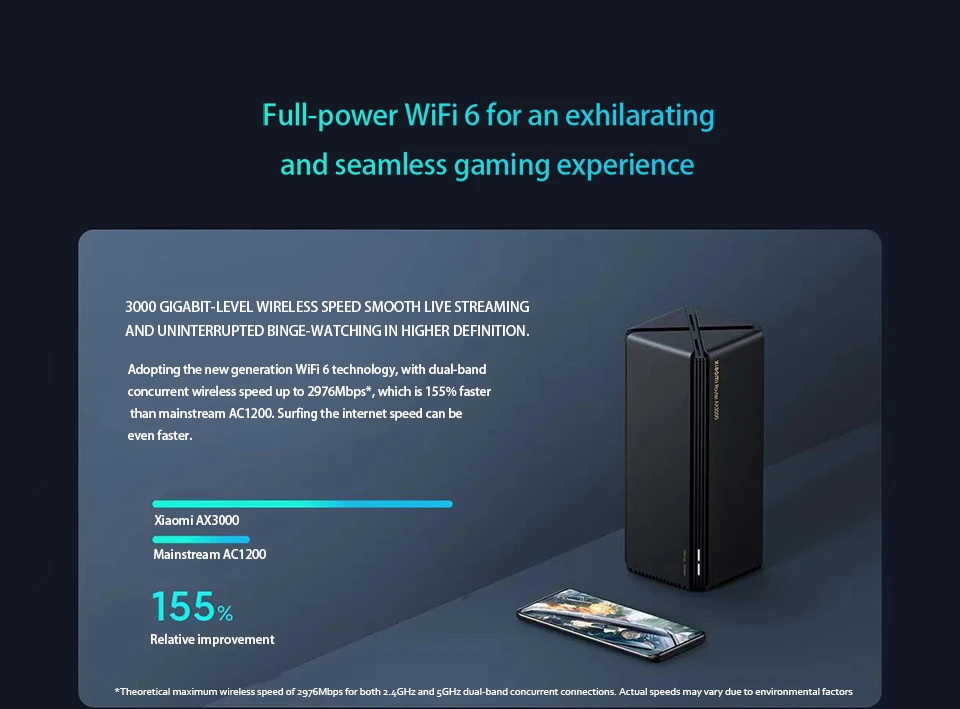 Adoptando la tecnología WiFi 6 de nueva generación, con velocidad inalámbrica concurrente de doble banda de hasta 2976Mbps *, que es un 155% más rápida que la corriente principal AC1200. Navegar por la velocidad de Internet puede ser aún más rápido.
