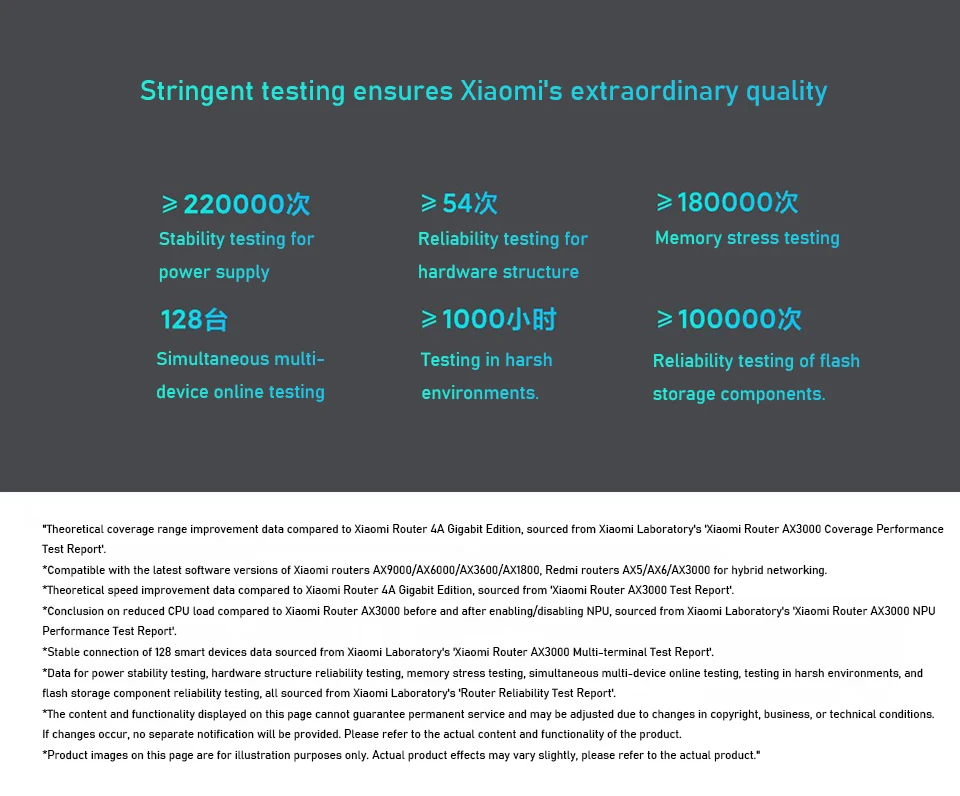 * Datos para pruebas de estabilidad de energía, pruebas de confiabilidad de estructura de hardware, pruebas de estrés de memoria, pruebas simultáneas en línea de múltiples dispositivos, pruebas en entornos hostiles y pruebas de confiabilidad de componentes de almacenamiento Flash, todo procedente del 'Informe de prueba de confiabilidad del rutador' de Xiaomi Laboratory.