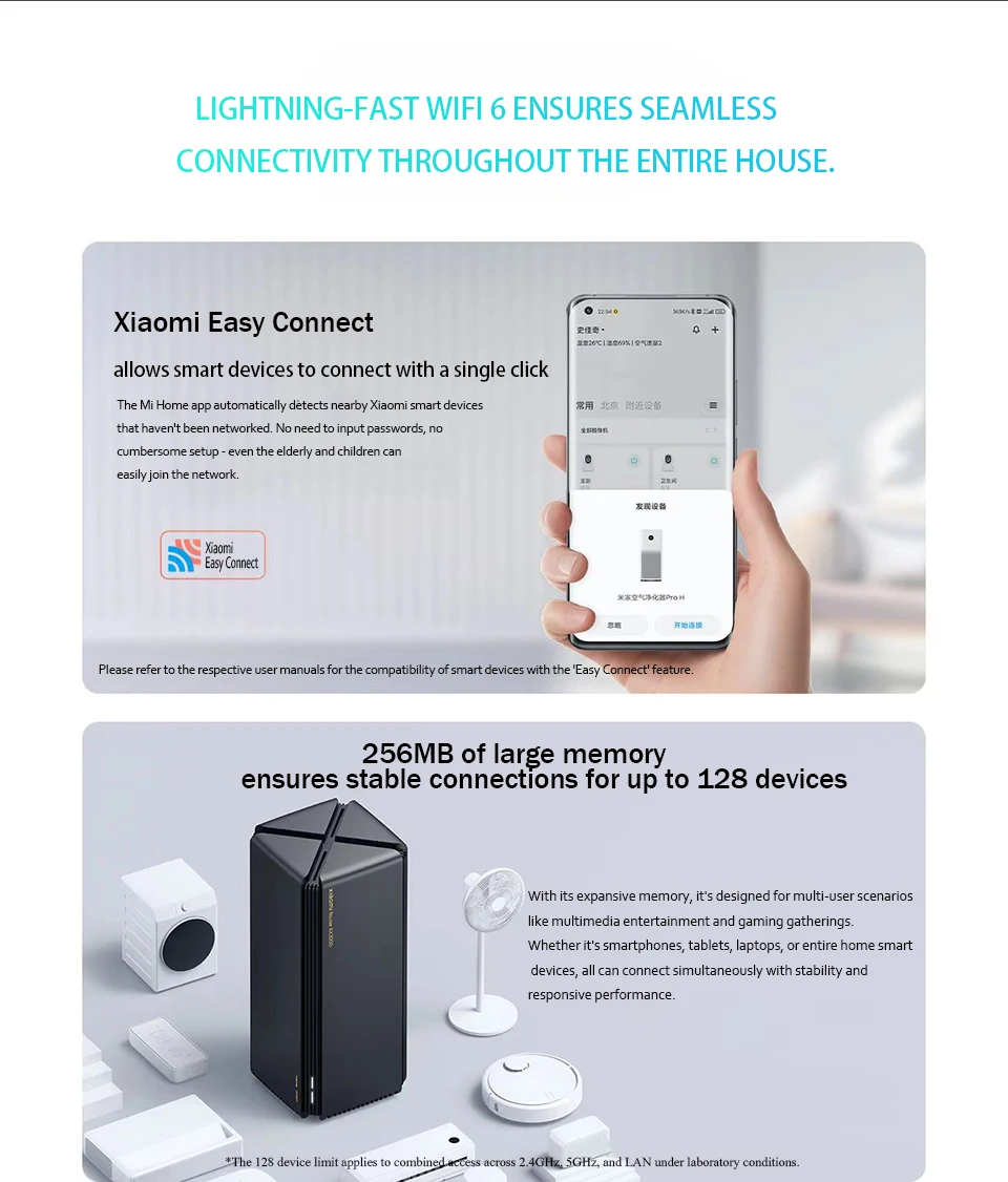 * Conexión estable de 128 datos de dispositivos inteligentes provenientes del 'Xiaomi Router AX3000 Multi-Terminal Test Report' del Laboratorio Xiaomi.