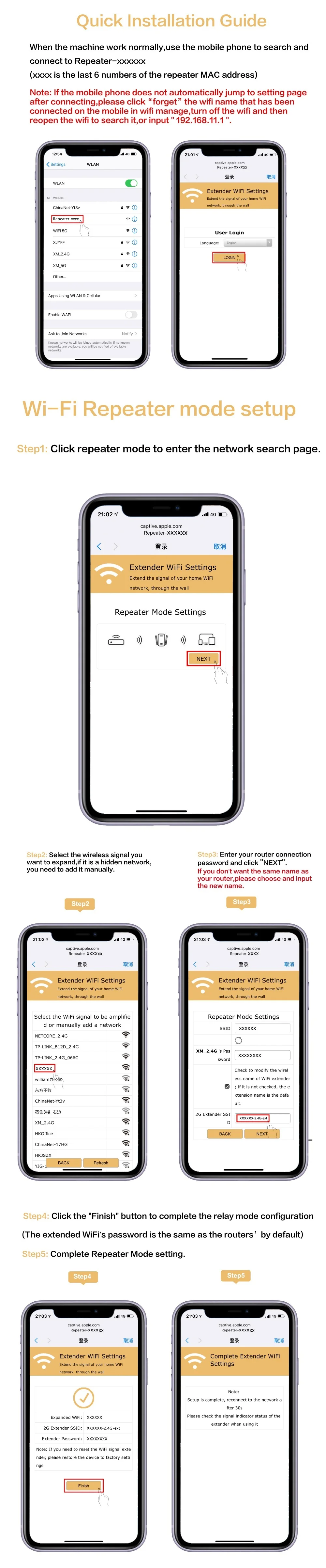 1.Cuando utilice un repetidor USB, busque RepeaterXXXXXX en el wifi de su teléfono o computadora, y hacer clic en la conexión lo redirigirá automáticamente a la página de configuración (nota: si no hay una interfaz redirigida después de hacer clic en la conexión de su teléfono, seleccione "Ingrese esta red" y reinicie el wifi de su teléfono para volver a conectarse.Si esta operación aún no funciona, puede ingresar manualmente la dirección del sitio web "192.168.11.1" en su navegador)