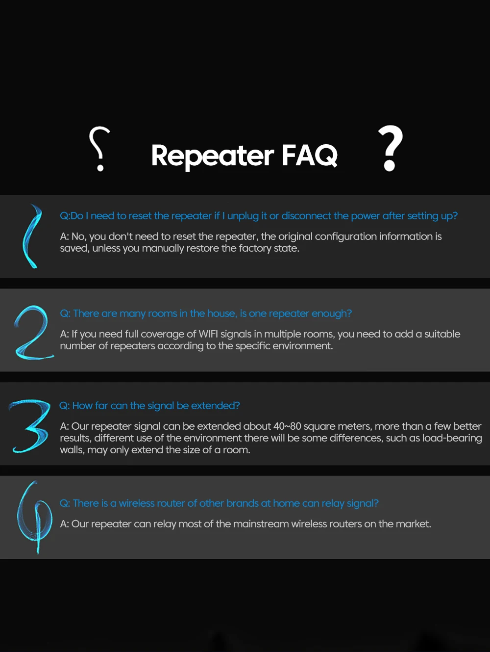 4. El producto tiene una función de memoria de apagado y, cuando se vuelve a encender después de un corte de energía, aún mantiene la configuración de expansión WiFi original. Si necesita configurar otras señales WiFi, mantenga presionado el botón de reinicio en la parte posterior para restaurar la configuración de fábrica y reconfigurarlo para su uso.