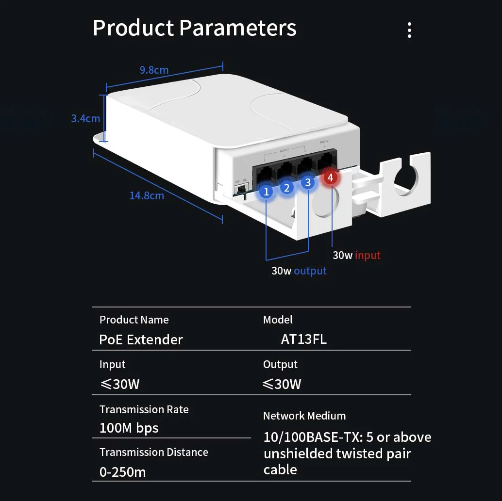 El extensor PoE de 5,3 puertos tiene 3 puertos Lan 10/100/1000M, entre ellos, uno para entrada de energía y los otros tres para salida de energía.Cumple con 10/100/1000 BASE-TX,IEEE 802.3 af-PoE.