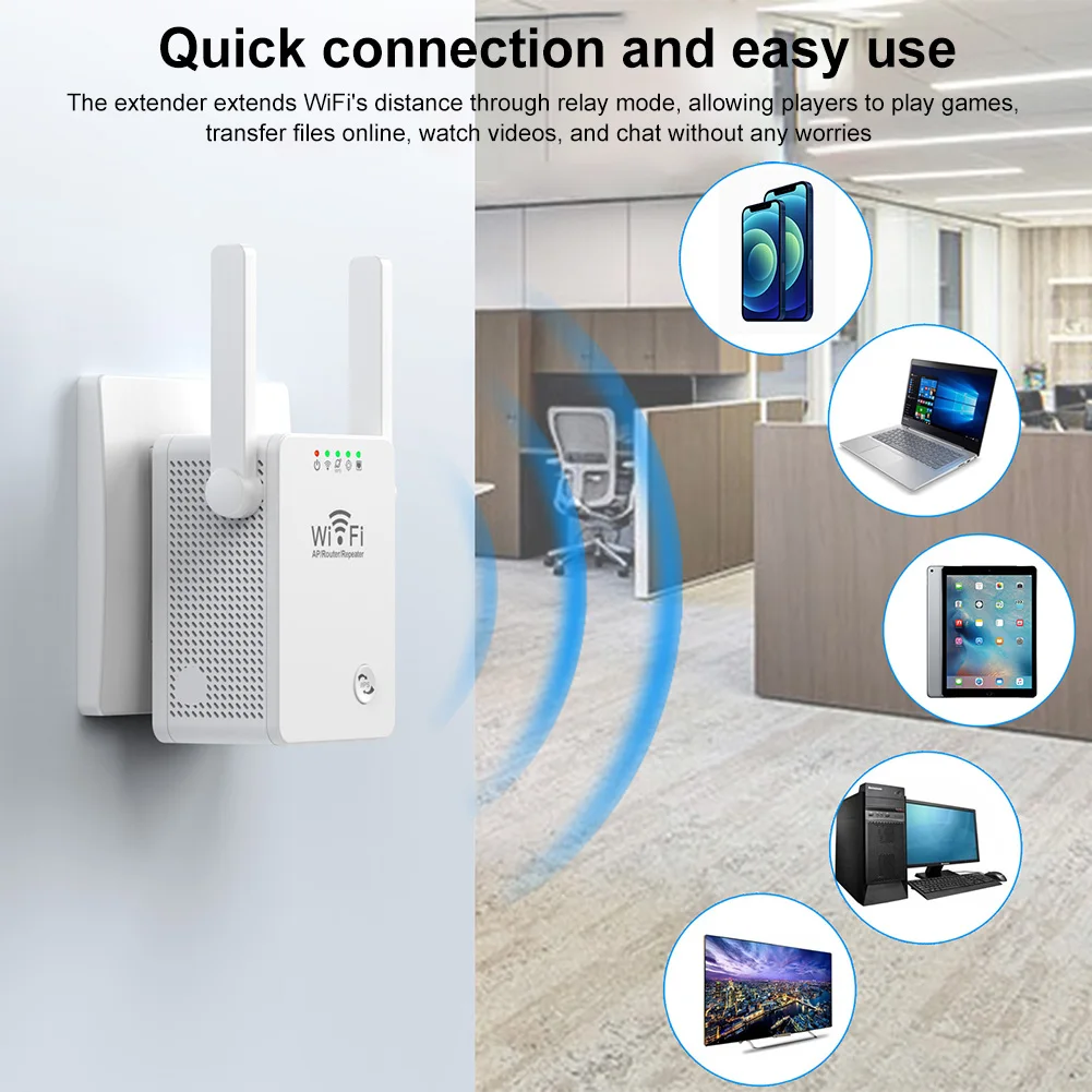 1. Amplificador de extensores WiFi:El modo extensor aumenta las señales inalámbricas a áreas previamente inalcanzables o difíciles de conectar. Solución perfecta para extender la cobertura Wi-Fi a zonas muertas y mejorar la intensidad de la señal en áreas de difícil acceso. Proporciona conectividad perfecta y velocidades de Internet más rápidas, lo que permite una experiencia de transmisión y navegación fluida.