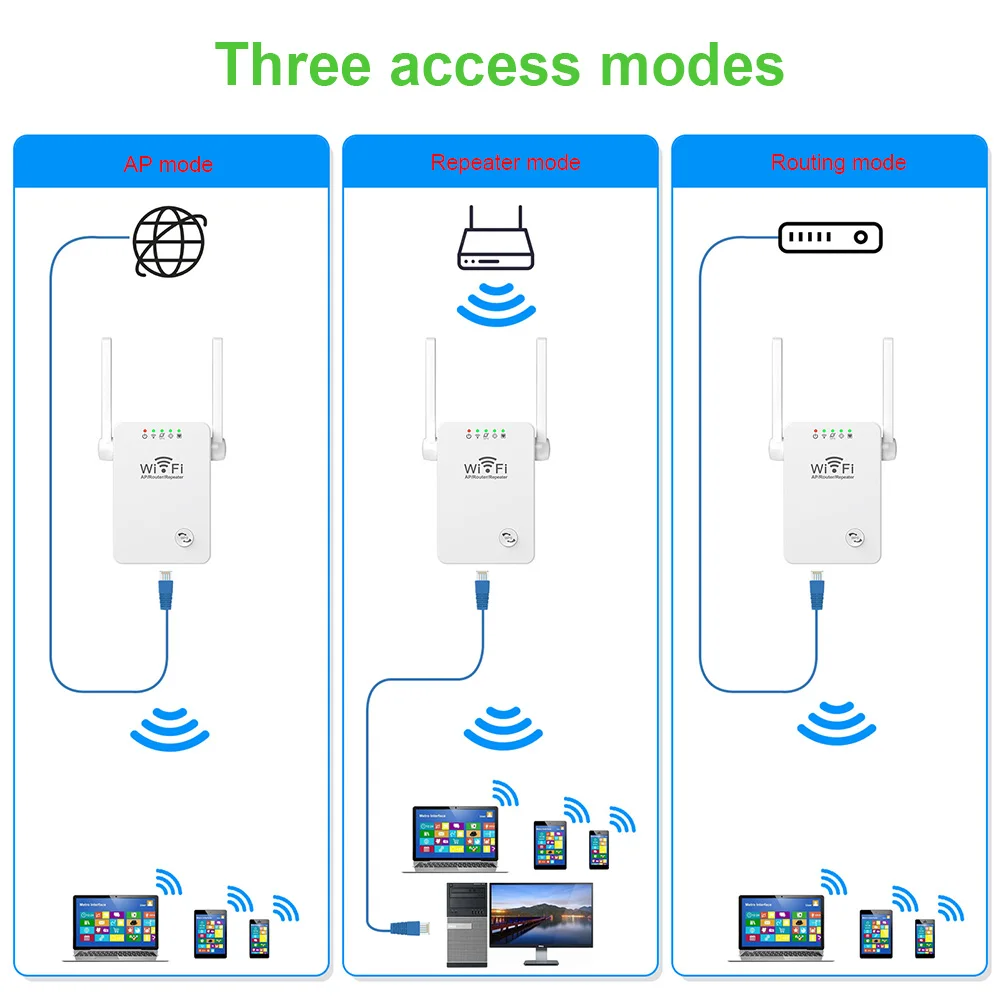 5. Tres modos de funcionamiento (modo AP, repetidor y enrutador):El repetidor WiFi proporciona opciones flexibles para diferentes escenarios. El modo AP convierte el extensor en un punto de acceso, ideal para agregar capacidades inalámbricas a dispositivos no inalámbricos. El modo repetidor extiende las señales Wi-Fi existentes, mientras que el modo enrutador le permite crear una red separada y administrar el acceso a los dispositivos.