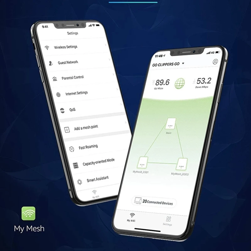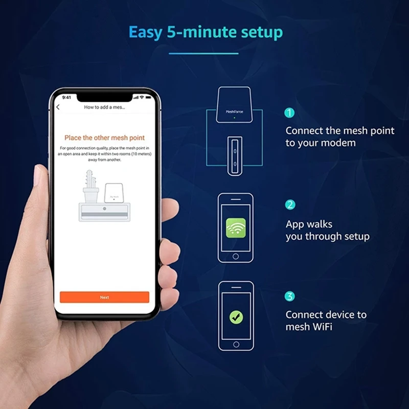 Fácil de configurar. Puedes configurarlo en cinco minutos. Primero conecte el mesh point a su módem, descargue la aplicación, siga los pasos de la aplicación para configurarla y listo. Después de eso, puede usar mi aplicación Mesh para el control de red, fácil de configurar y conveniente de controlar.