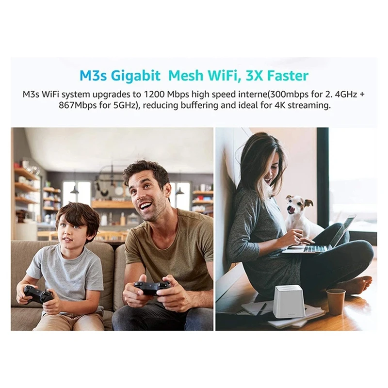 WiFi de malla Gigabit, 3X más rápido. El sistema WiFi M3s está actualizado a internet de alta velocidad de 1200 Mbps (300mbps para 2. 4GHz + 867Mbps para 5GHz), reduciendo el amortiguamiento y brindando mayor comodidad a su entretenimiento en el trabajo y la vida, perfecto para la transmisión en 4K.