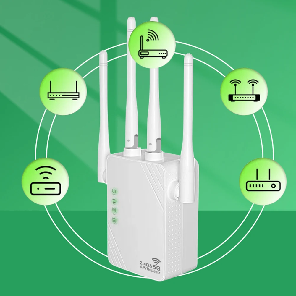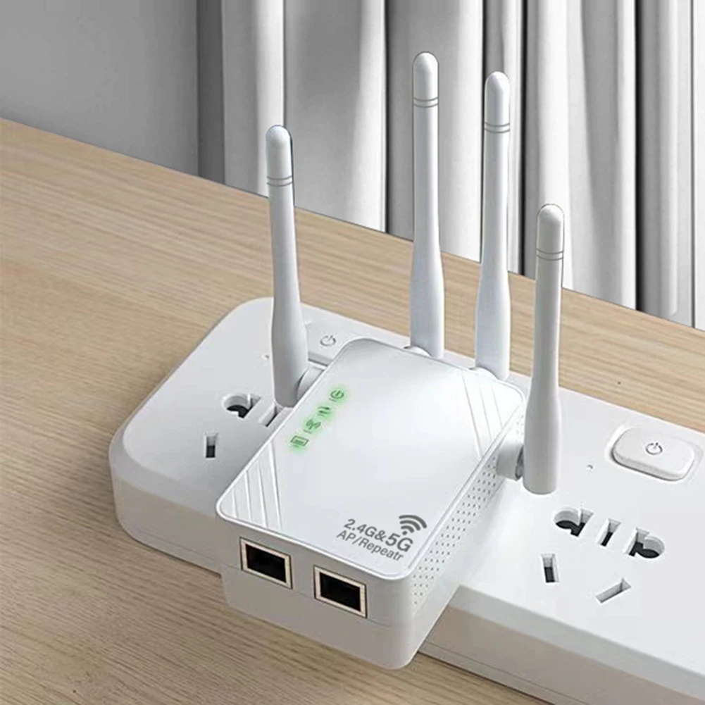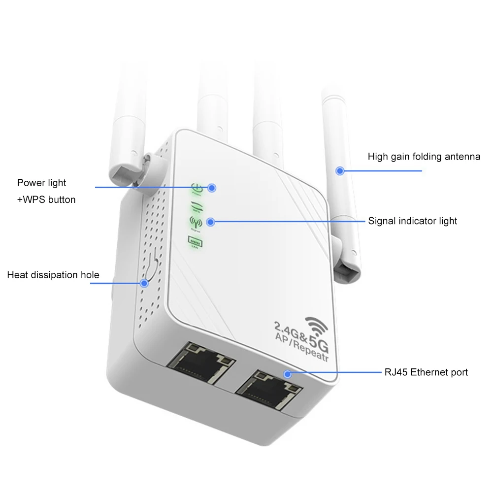 Característica:1. Cobertura de señal superior:Nuestro repetidor WiFi inalámbrico ofrece una cobertura inalámbrica de red WLAN mejorada, lo que garantiza una extensión de señal WiFi de gran alcance, incluso a las áreas más remotas de su hogar. Con velocidades de transmisión de hasta 300Mbps/867Mbps, el dispositivo ofrece una potente señal que admite juegos en línea ininterrumpidos, videollamadas y transmisión de vídeo 4K HD.