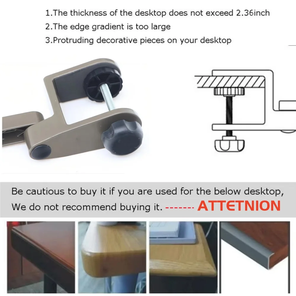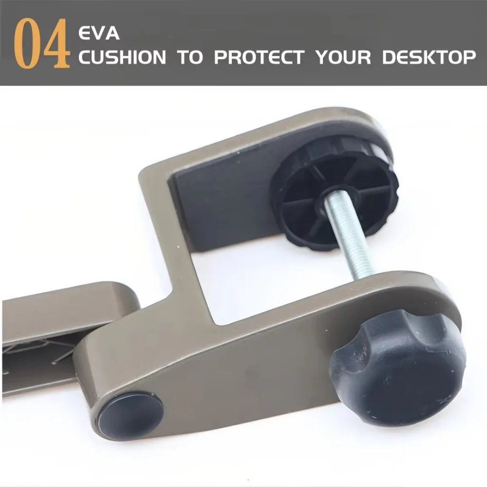 4.**Abrazadera de aleación de aluminio**: Abrazadera duradera y resistente hecha de aleación de aluminio de alta calidad, que garantiza un ajuste seguro en escritorios de varios espesores.