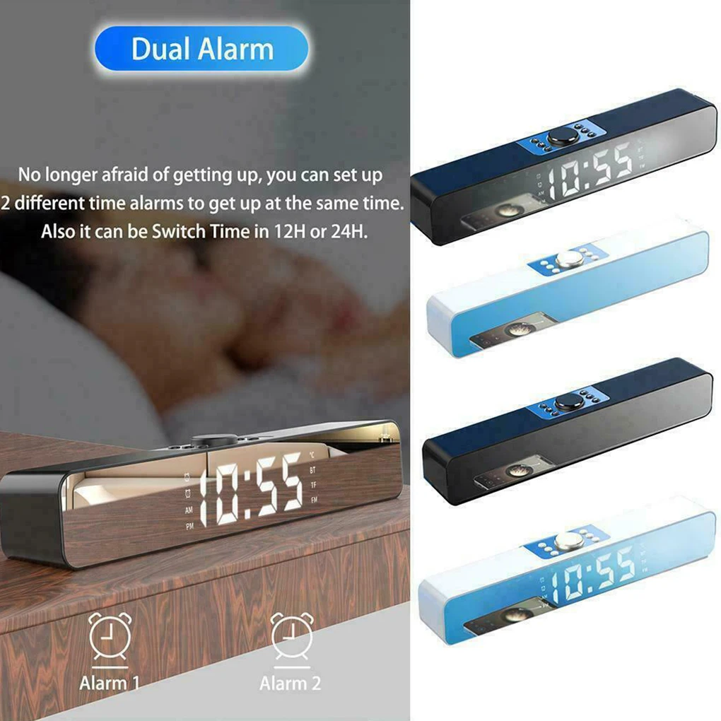 Special Design: This LED wireless soundbar dual alarms and snooze function and has a LED mirror screen to display time, alarm, temperature.