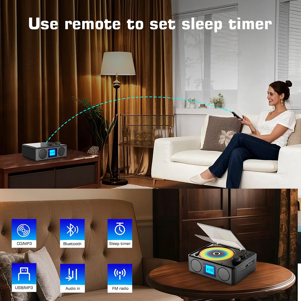 Discos CD/MP3/unidades flash USB/tarjetas TF/Bluetooth/radio FM: la compatibilidad versátil le permite disfrutar de música desde varias fuentes, incluidos discos CD/MP3, unidades flash USB, tarjetas TF, Bluetooth y radio FM