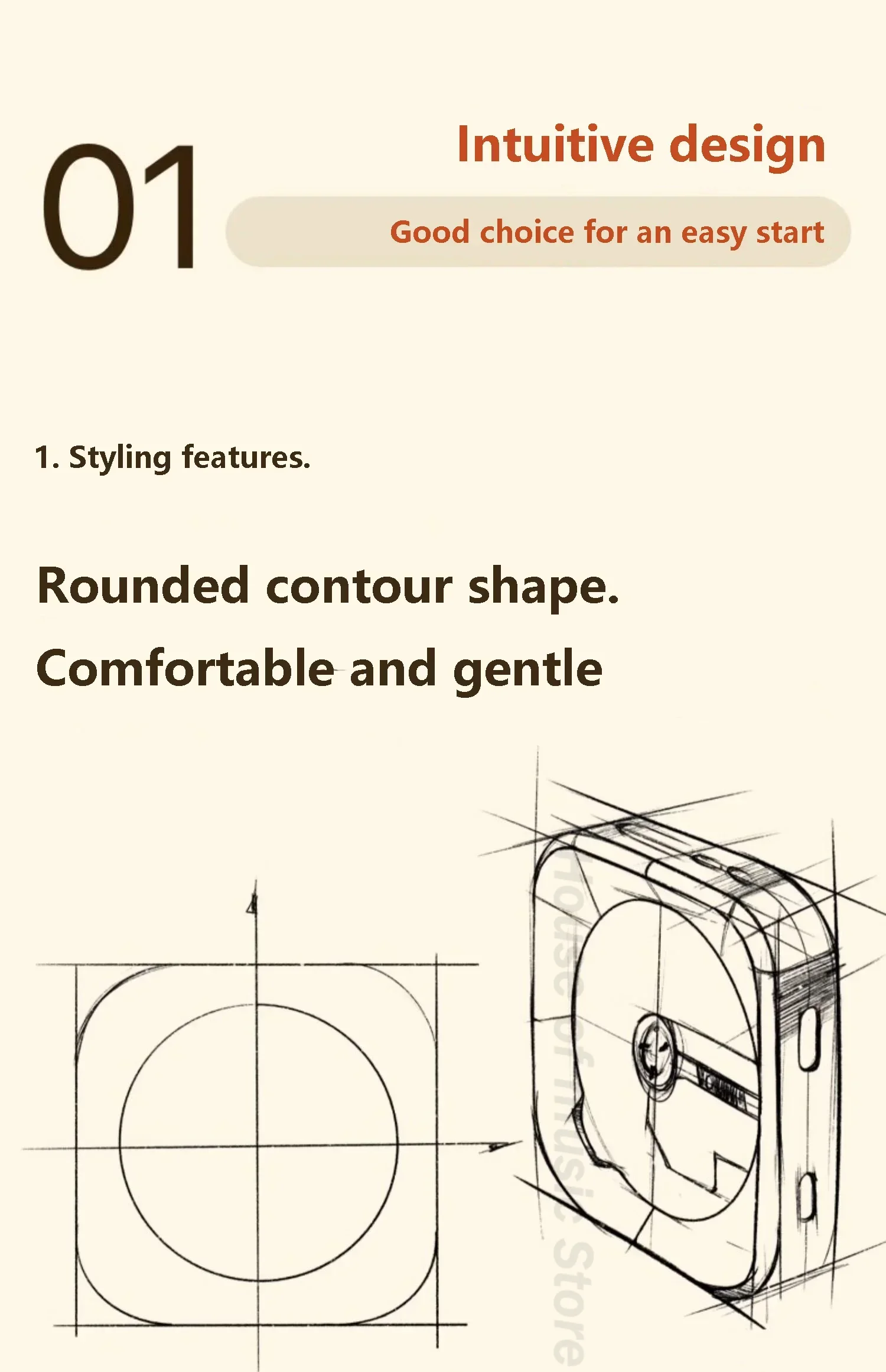 1: Características de estilo: modelado de contorno redondeado, acercar a la sensación suave de comodidad